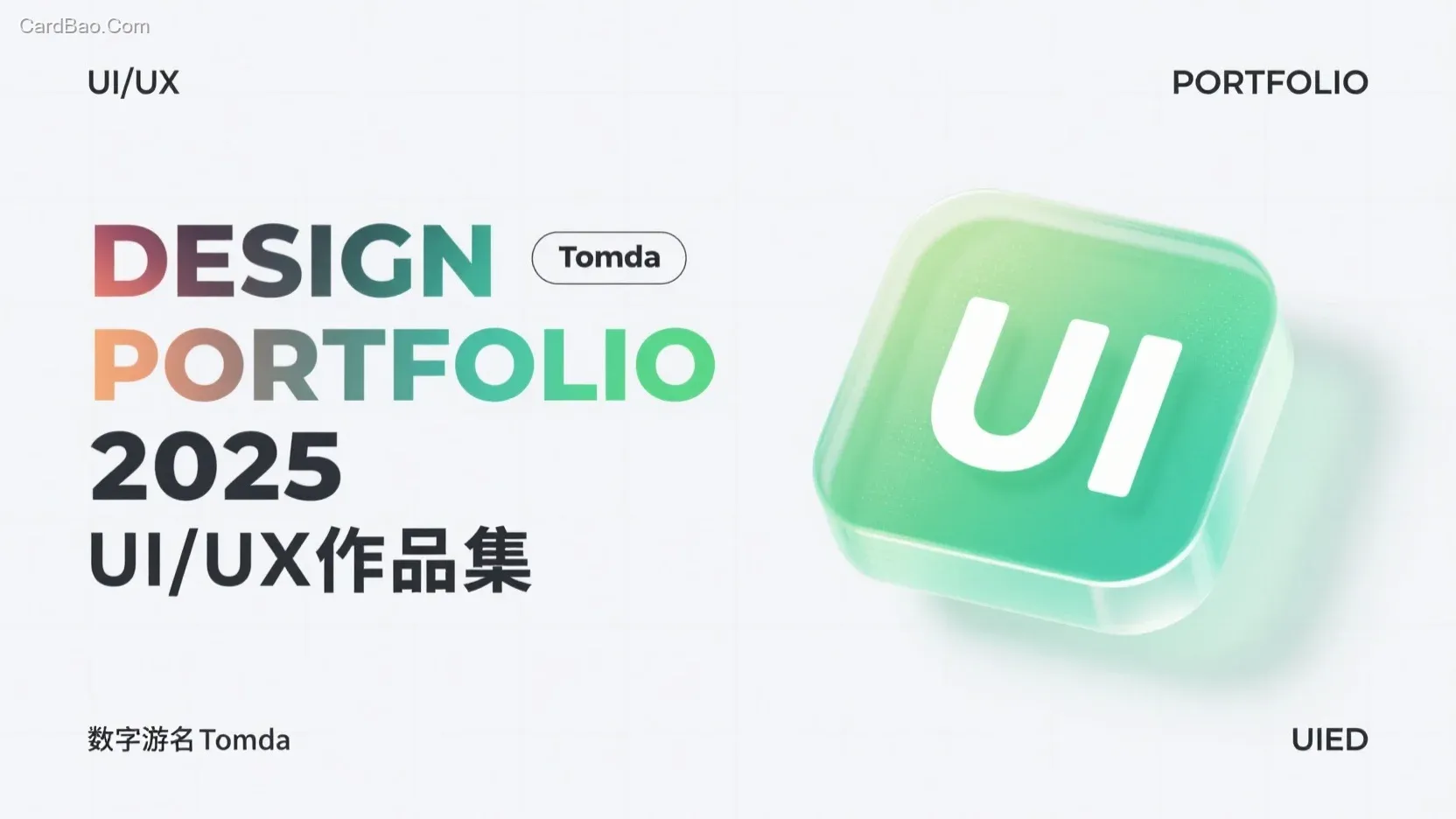 纯白带点渐变弥散背景采用毛玻璃质感,点缀若隐若现的淡灰色网格线,右侧的“UI”被设计成可交互的透明按钮样式,绿色半透明材质表面叠加轻微的噪点纹理,立体悬浮感,作品标题在左侧“DESIGN PORTFOLIO 2025”以及“UI/UX作品集”以渐变大字体呈现,在文字穿插一个标签设计“Tomda”,左上角“UI/UX”左下角“数字游名Tomda” 右上角“PORTFOLIO”右下角“UIED”以小字体呈现