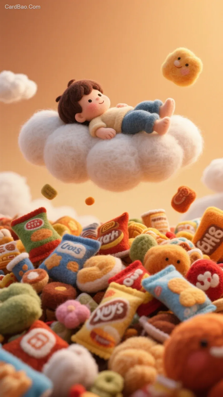 A warm-toned felt painting, exuding a rich felt style throughout, with every detail radiating the unique texture and charm of felt. A child lies amidst a pile of snacks, floating on clouds.