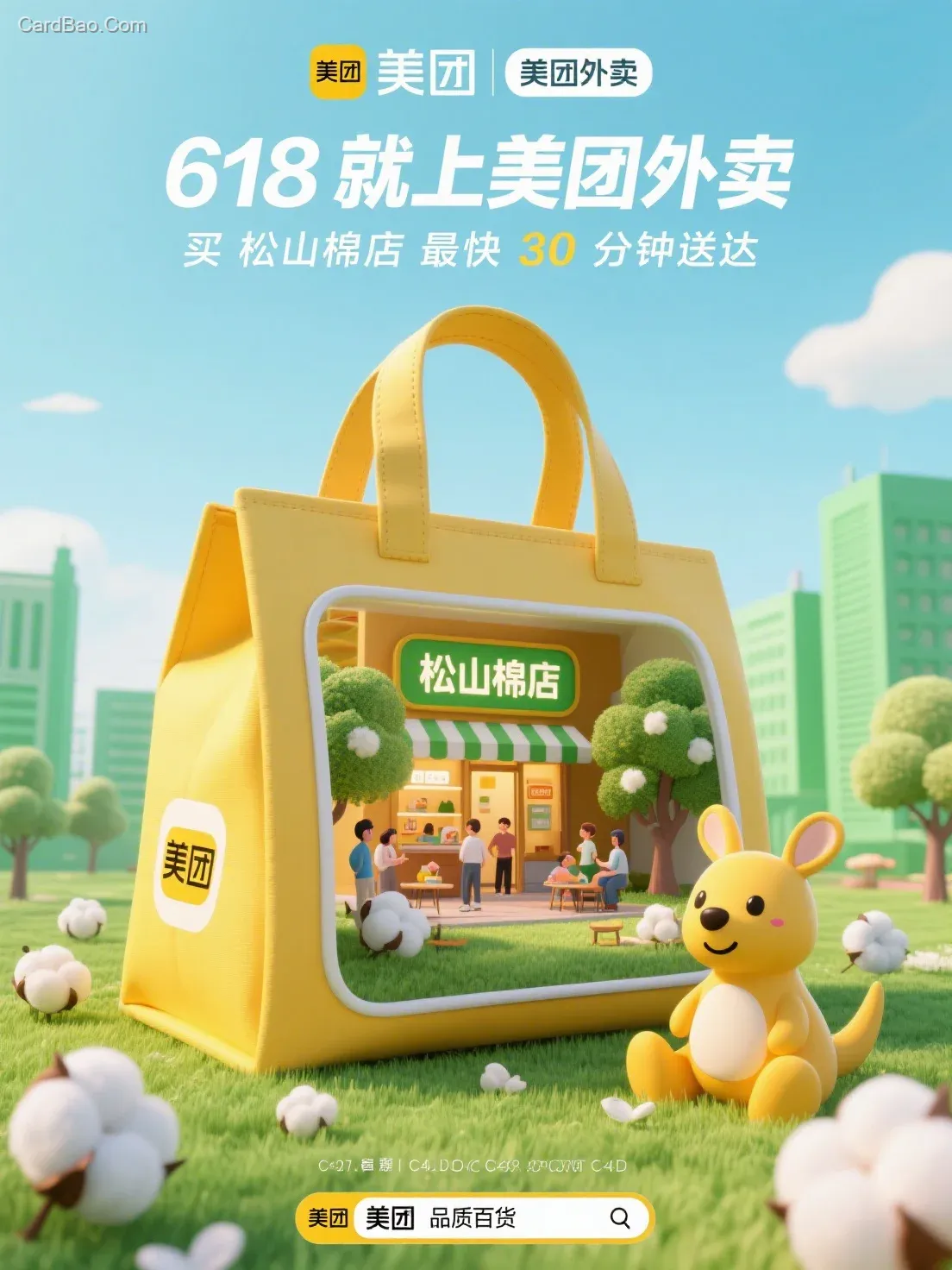 一张美团外卖 618 促销宣传图,画面上方有 “美团”“美团外卖”“松山棉店” 标识,白色大字写着 “618 就上美团外卖 买 松山棉店 最快 30 分钟送达”。画面中央是一个巨大的美团外卖手提袋造型,袋子上有美团外卖标志,内部展示松山棉店场景,有树木、人物在休闲活动,上方有绿色 “松山棉店” 标牌。手提袋外是绿色草地,点缀白色棉花,一只黄色美团袋鼠玩偶坐在草地上。背景是浅蓝色天空和绿色城市建筑轮廓。底部有 “美团 品质百货” 搜索栏。整体传达 618 期间通过美团外卖购买松山棉店商品快速送达的信息,画面充满活力与生活气息
