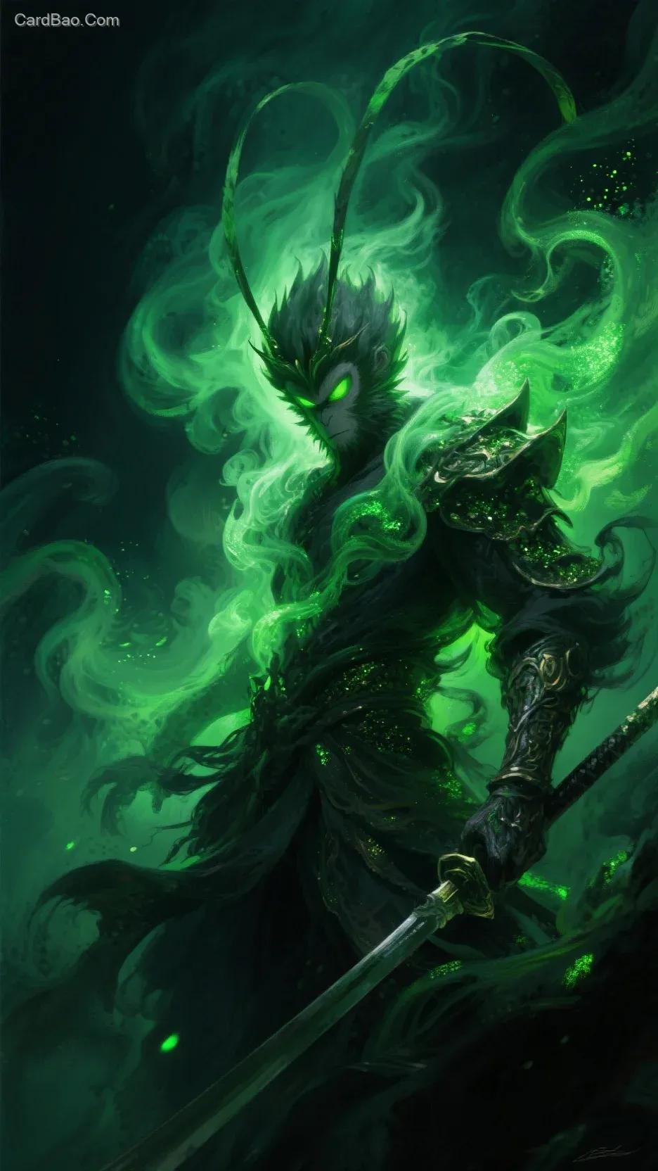 暗黑,丙烯颜料画,张扬,深绿,绿色闪光,由绿色烟雾粒子生成的孙悟空刺客,烟雾弥漫缠绕,梦核,虚幻,朦胧,悬浮,半透明,渐变,大风,阴暗画风。