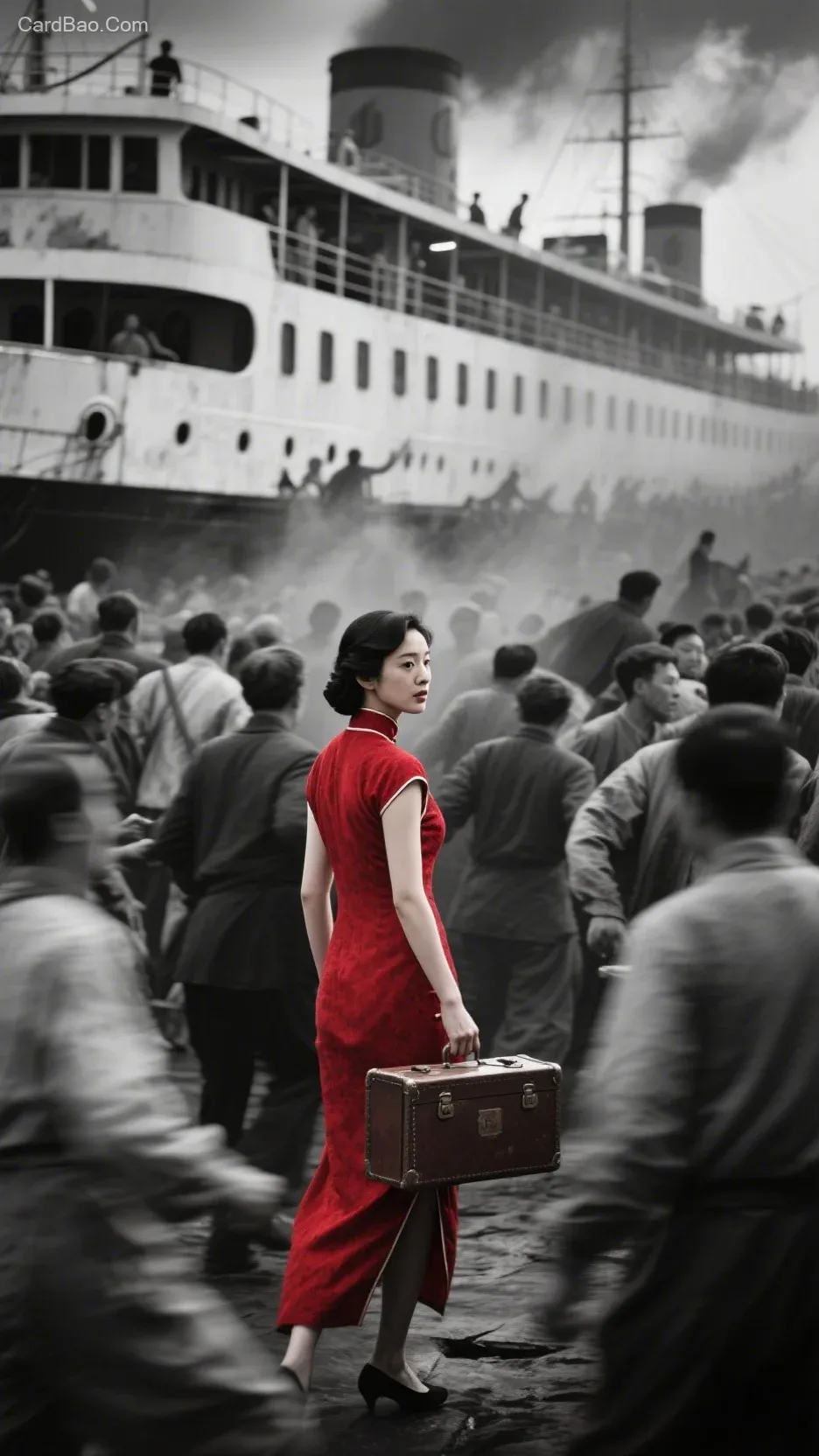 During the Republican era, fleeing from hardship, a steamship, a woman of refined elegance and intellect, slender, with ethereal beauty. A graceful figure in a red cheongsam, holding a suitcase, turns amidst a crowd rendered in black and white. Multiple exposures, semi-transparent layers, intricate interplay of light and shadow, the figure enveloped in luminous halos. High-purity colors, close-up shots with intentional out-of-focus obstruction, heightened dramatic tension, atmosphere charged with emotion. Ayase Haruka, textured surfaces, stark contrasts, dreamlike quality, perspective-driven aesthetics, extreme composition, dreamcore exploration, cinematic grandeur, surrealism, meticulous detailing, high-end sophistication, masterpiece, photographic artwork, long exposure with motion blur, trailing silhouettes.