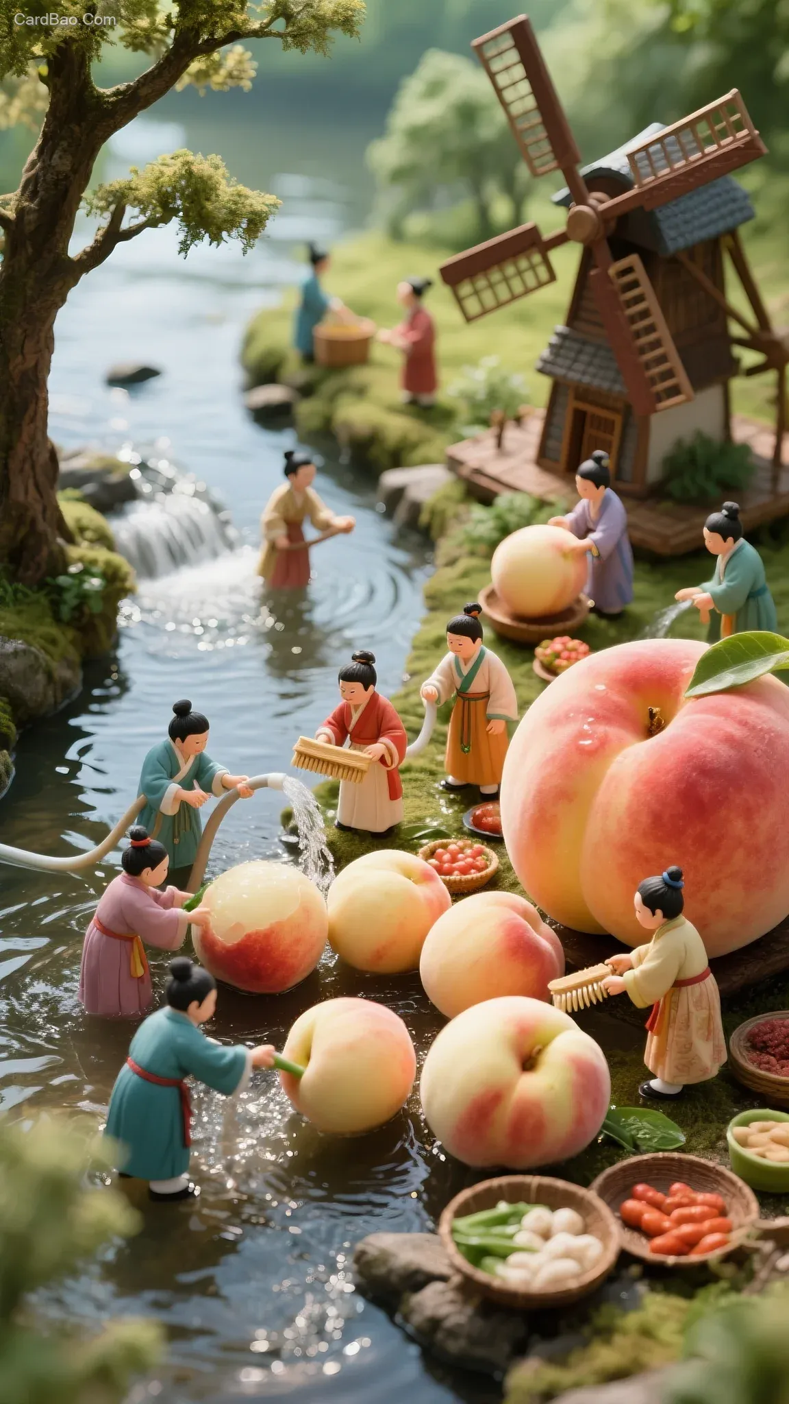 微缩古风景观,桃子加工:在美丽的溪水边,溪水边有树有水风车等等,十几个身穿古风服饰的小人们正在将采摘来的巨大桃子放在溪水边进行处理。有的小人在拿着水管冲洗桃子,有的在用刷子刷洗桃子,还有的在准备其他食材。巨大的桃子在小人们手中显得格外大,而小人们则显得非常灵巧。