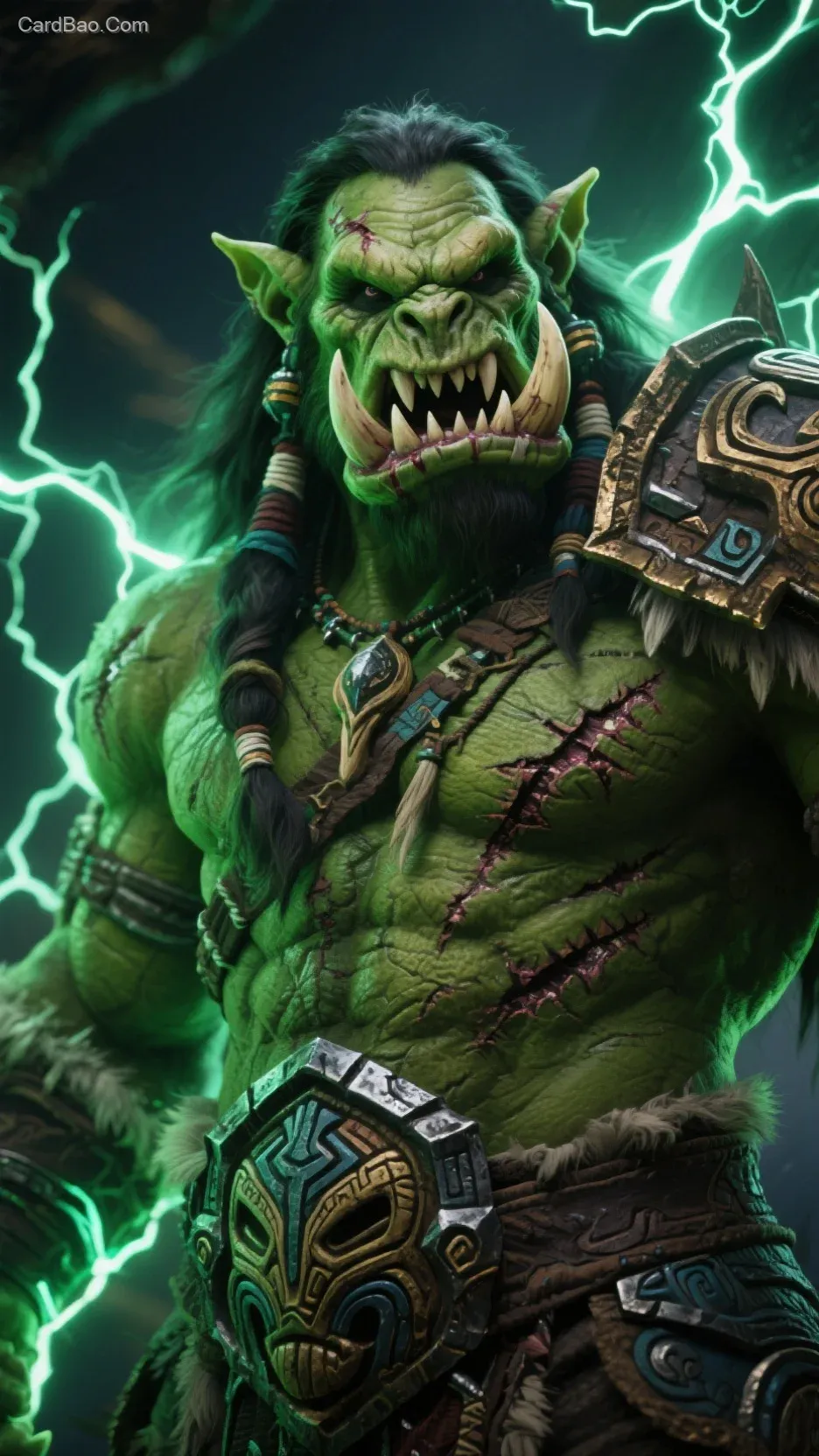 魔兽世界人物萨尔上半身特写,绿色兽人萨满特点,精细的纹理,鲜明的刀疤,巨大的牙齿,萨满图腾铠甲,闪电法术波。杰作,8K.摄影光照。