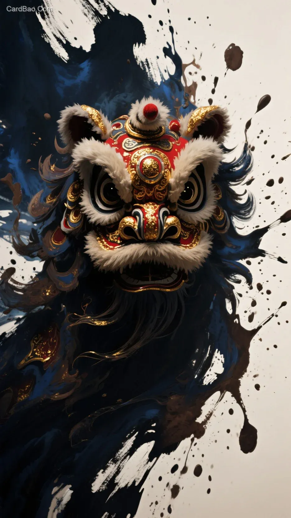 Visual impact, dark shades of blue and brown, ink fluid effects, particle splashes, rugged texture, high depth of field, layered depth of field, perfect lighting, elegant brushstrokes, ultra-high-definition detailing, masterpiece quality, dark aesthetics. Exquisitely crafted lion dance head, gold powder and cinnabar accents, matte texture.