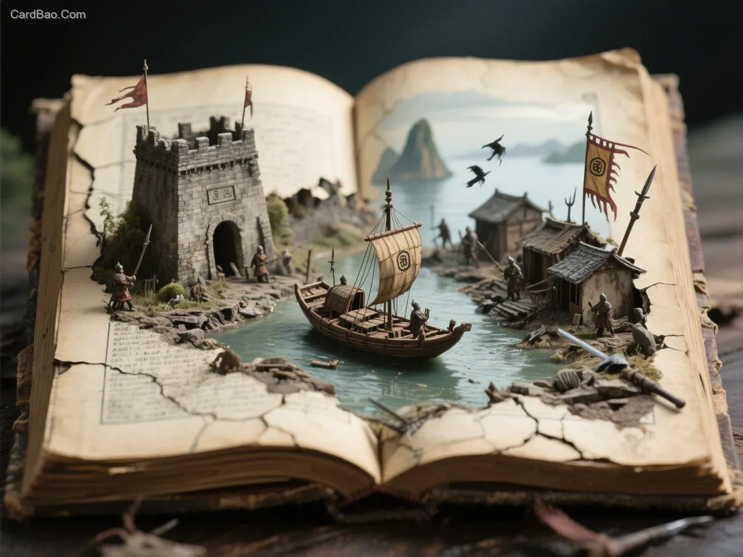 This photograph shows an open ancient book, revealing a miniature depiction of the Battle of Red Cliffs from the Three Kingdoms period. Ancient warships, a dilapidated fortress tower, collapsed houses, remnants of weapons, flags, and faint traces of lingering warrior spirits can be seen drifting by. The surface of the ancient book is cracked and weathered, evoking a strong sense of age and history. This image presents a surreal and whimsical representation of the natural world, suggesting that even the smallest things can contain their own universe.