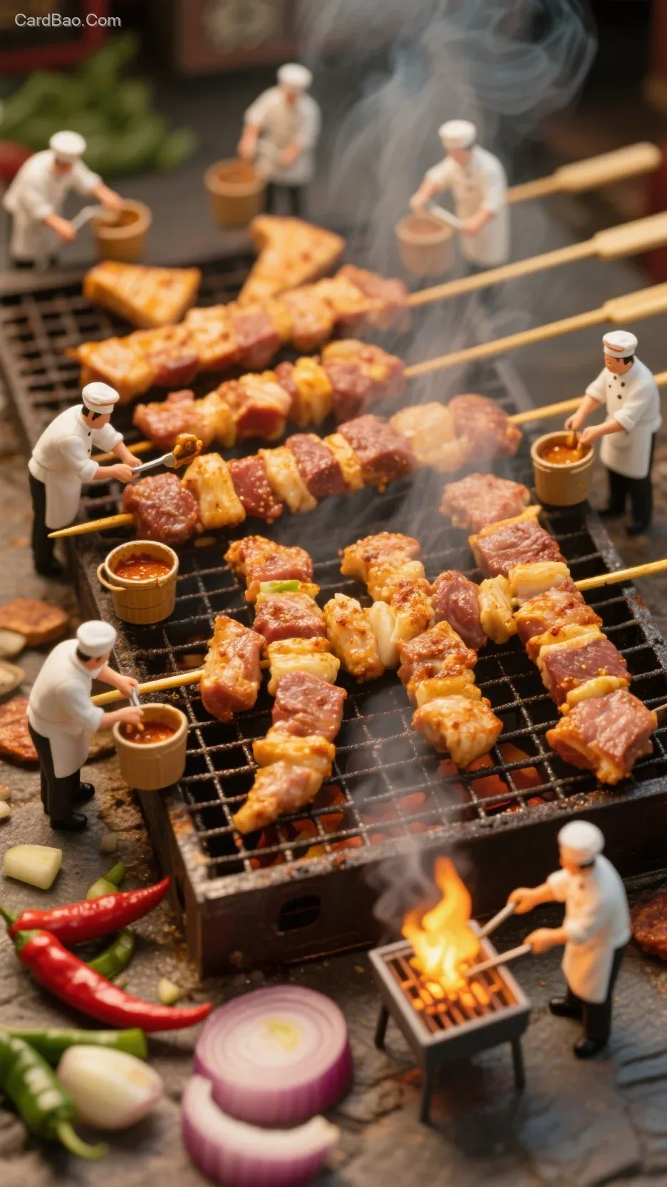 An isometric diorama, a miniature photograph featuring tiny Chinese chefs dressed in white, preparing a large quantity of skewered meat on giant kebabs. Some are marinating meat chunks in small barrels, while others carefully thread the meat onto the skewers using miniature tools. The kebabs are arranged in the shape of the Chinese characters "兰州" (Lanzhou). One team is chopping vegetables like chili peppers and onions, while another worker tends to a small grill, with flickering flames beneath the meat. The skewered meat is juicy and golden, with steam rising from the surface. Warm, fiery tones highlight the rustic texture. Ultra-realistic macro photography, cinematic lighting, 8K resolution, whimsical and mouthwatering atmosphere.