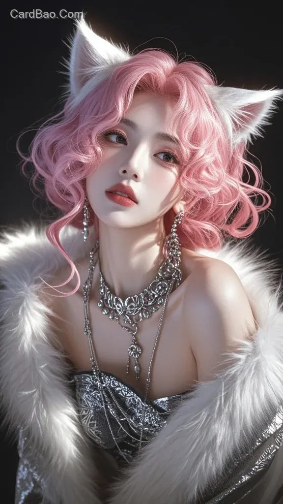 黑色背景。妖冶,冷白皮,一个女人,精致妆容,眼尾细长,眼睛微眯,粉色卷发,猫耳(发型零碎,微微遮住眼睛),露锁骨,穿貂毛银白色暗绒古装,带耳环,项链。阳光从侧面打在他身上。仰头,唯美,氛围感。姿势合理,近距离,人物特写,画风暗黑,大师杰作,厚涂,光感,朦胧,8K,逼真,构图合理有层次,超清,细节。