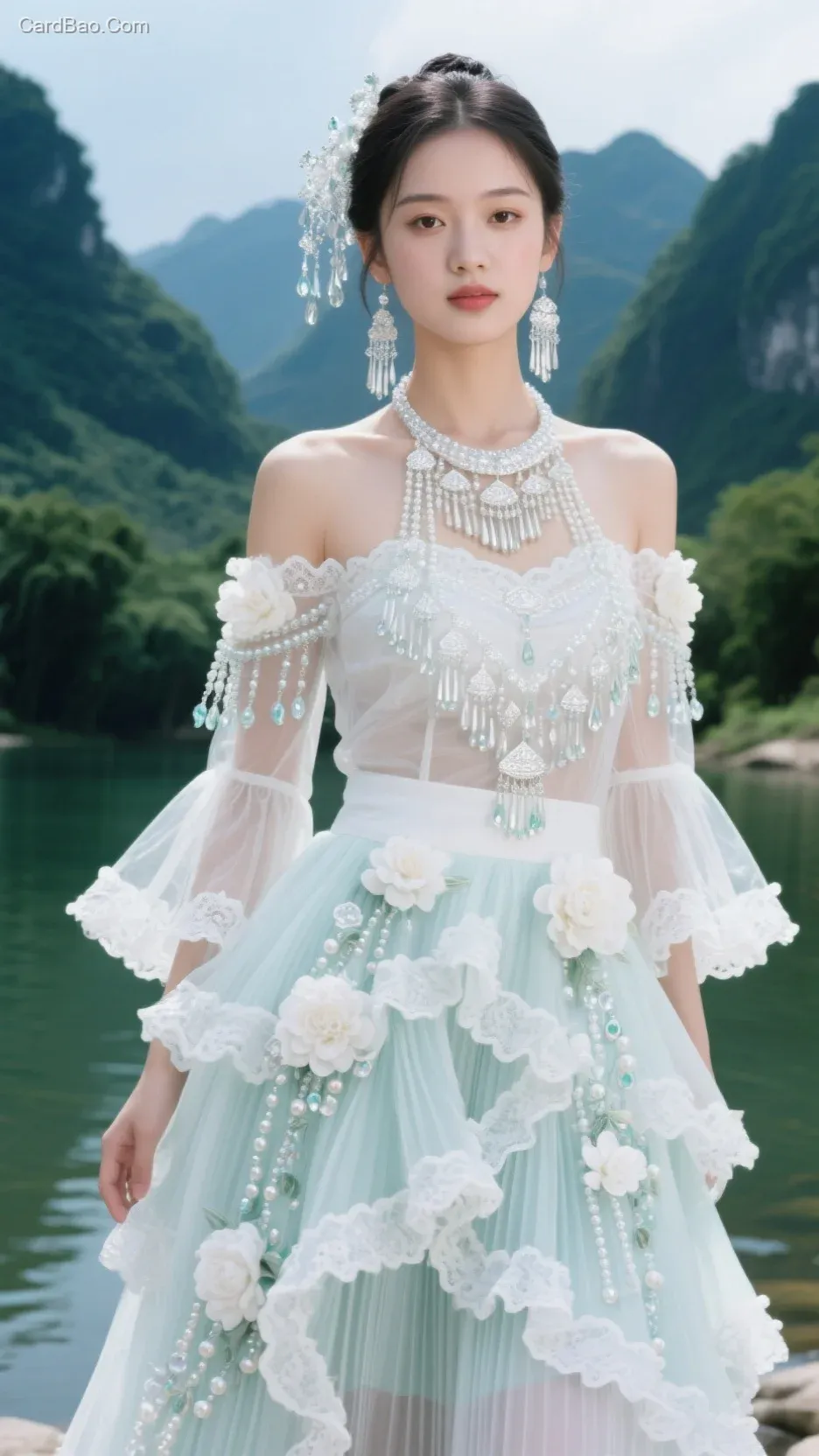 Set against a backdrop of lush green mountains and clear waters, a beautiful Miao ethnic girl is adorned with a crystal bead fringe necklace that drapes elegantly over her one-shoulder dress. The dress features transparent bell sleeves decorated with three-dimensional floral appliqués and delicate ruffled edges, all embellished with crystal fringes. The traditional Miao attire includes a multi-layered, asymmetrical bell-shaped skirt with ruffled trims, adorned with three-dimensional floral details and surrounded by crystal bead fringes. The full-body portrait is captured in shades of white and cyan, exuding a romantic, luxurious, and elegant atmosphere.