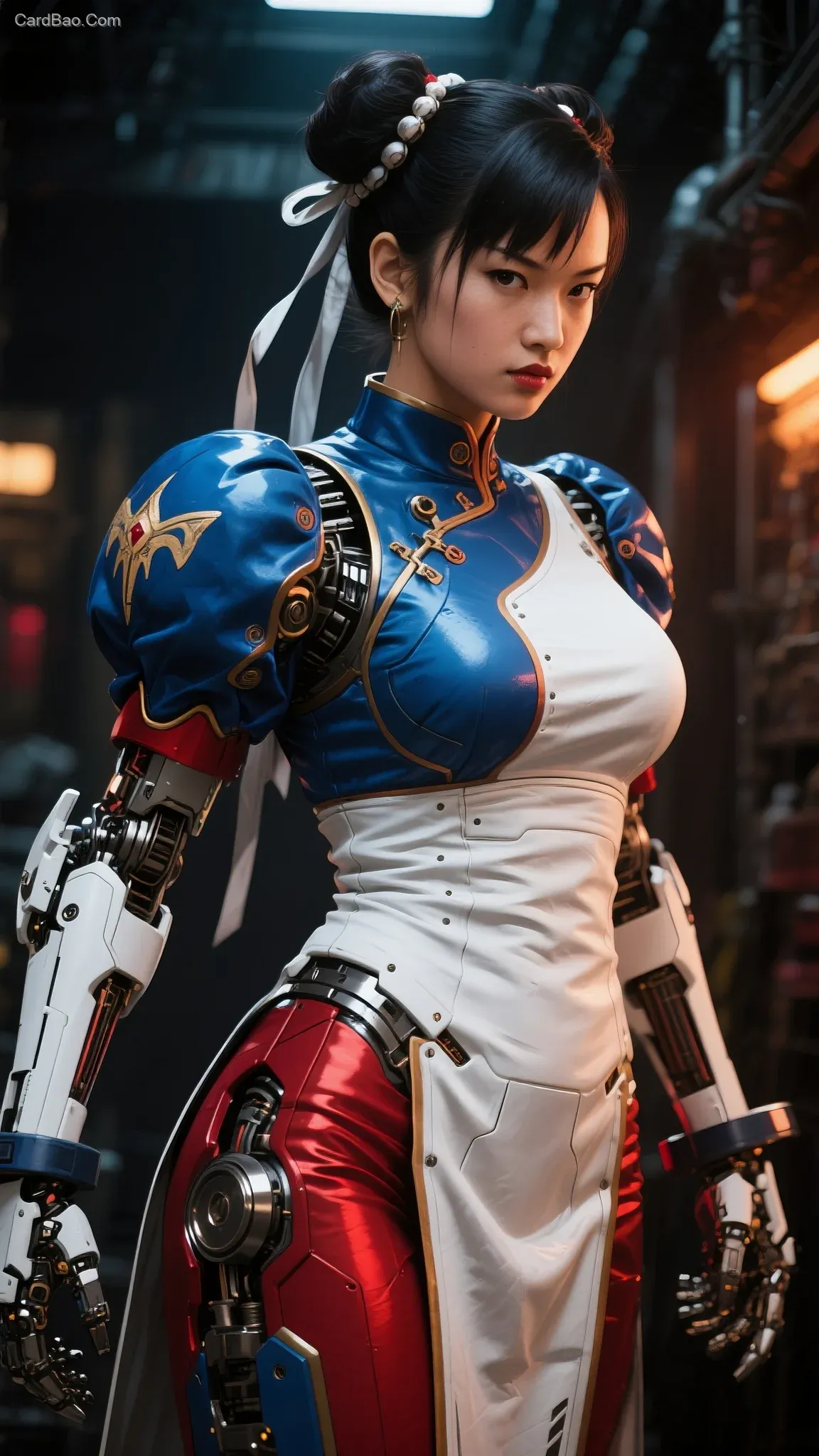 Ultra-detailed, intricate details, blue-red-white color scheme, Street Fighter's Chun-Li, Diablo-inspired style, luminous mechanical aesthetics, industrial-grade detailing, cinematic lighting, 8K resolution, warm color tone.