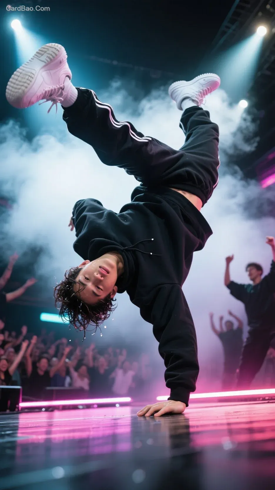 A handsome 25-year-old youth, dressed in an oversized black hoodie and athletic pants with white air-cushioned sneakers, performs a one-handed handstand at the center of the stage, pushing his body upward. A spotlight beam cuts through the dry ice smoke on stage, illuminating the sweat droplets on his hair. The blurred background of the audience erupts in waves of cheers. In 8K ultra-high definition, the fabric of his pants creates motion blur as he spins rapidly at high speed. A low-angle shot captures the detailed tread pattern on the soles of his shoes as he executes a mid-air split. Neon lighting reflects off his damp temples, creating scattered highlights. Motion blur effects emphasize the power of his whirlwind kick, while the silhouettes of dancers cheering and waving their arms are visible at the edge of the stage.