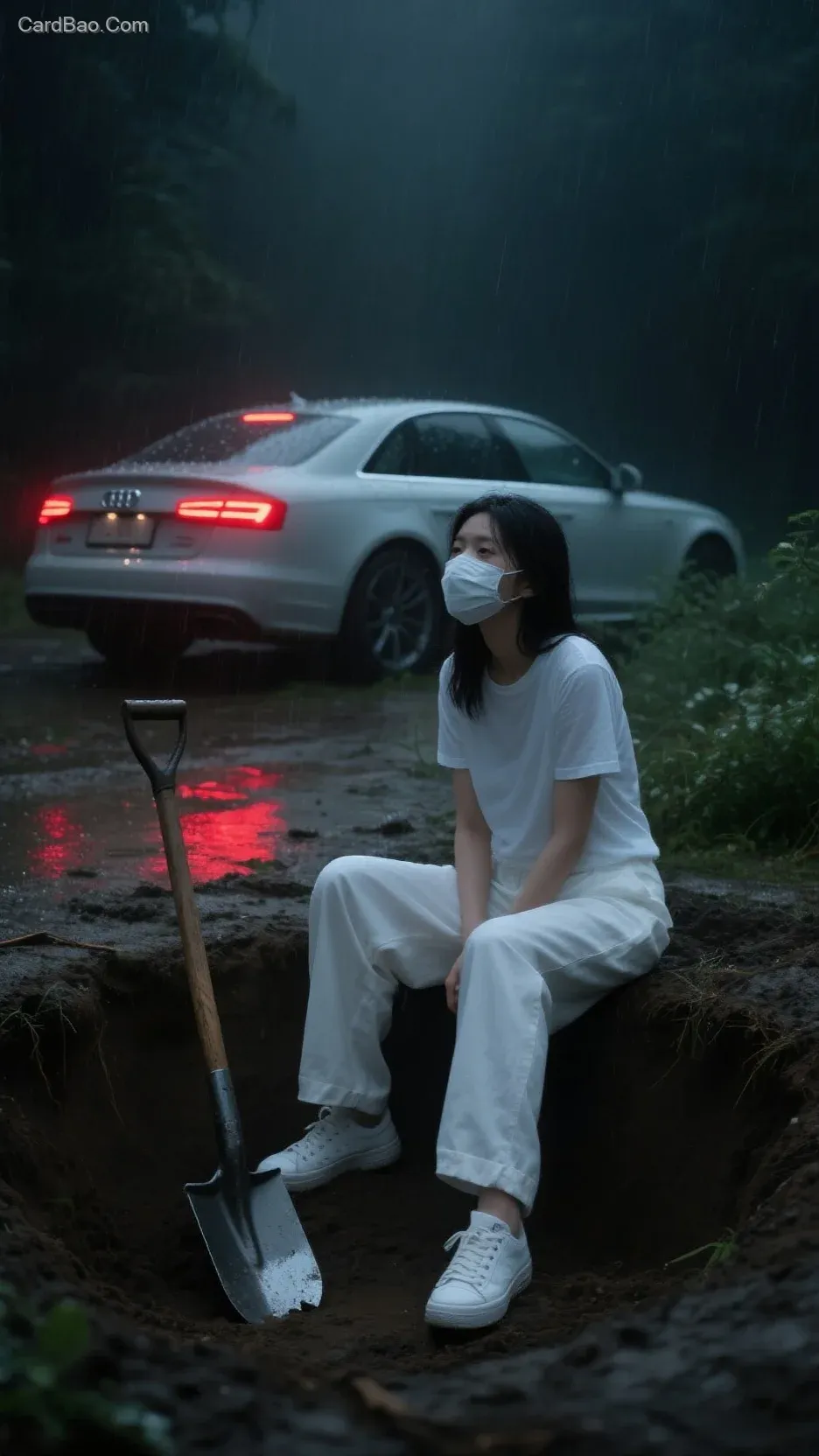 A woman wearing a white t - shirt, white wide - leg pants and white sneakers, sitting by a pit in the rain at night, with an Audi car in the background, a shovel beside her, wearing a mask, the scene is dim and melancholy, realistic style, 8k, high detail.(一位身着白色T恤、白色阔腿裤与白色运动鞋的女子,雨夜坐在土坑旁,背景有一辆奥迪车,身旁放着铁锹,戴着口罩,场景昏暗又带 melancholy ,写实风格,8k,高细节 )