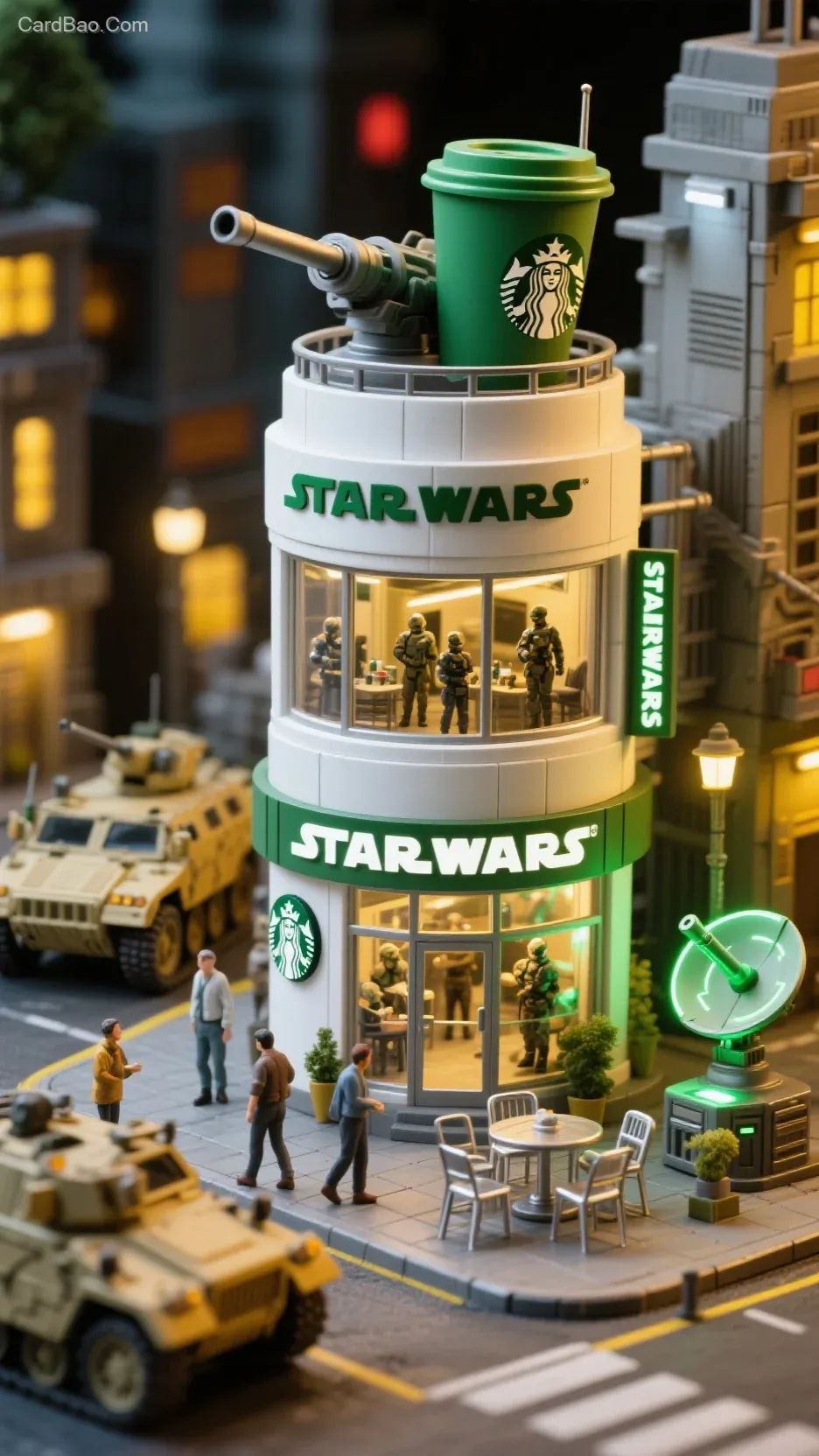 星球大战风格,整体风格与场景采用微缩景观,构建一个精致的战斗城市街角场景。画面中心是一座造型独特的星巴克炮楼,外形设计成超大号的星巴克咖啡炮塔样式,具有强烈视觉冲击力。主体建筑炮楼主体为白色,带有星巴克经典绿色标识和品牌名 “STARWARS” ,顶部有绿色的咖啡杯盖和炮塔。炮楼为两层结构,一层和二层均有通透的玻璃门窗,能看到内部战斗人员就座、交流或使用电子控制设备的场景,营造出紧张刺激的氛围。周边元素炮楼外部设置露天雷达,搭配绿色透明能量护盾、金属桌椅,有平民在此享受休战时光。周围街道上有行人、巡逻的士兵,街道边有装甲车辆行驶或停靠,添加街道、绿植、路灯等城市街景元素,丰富画面层次,体现热闹且战争化的氛围。