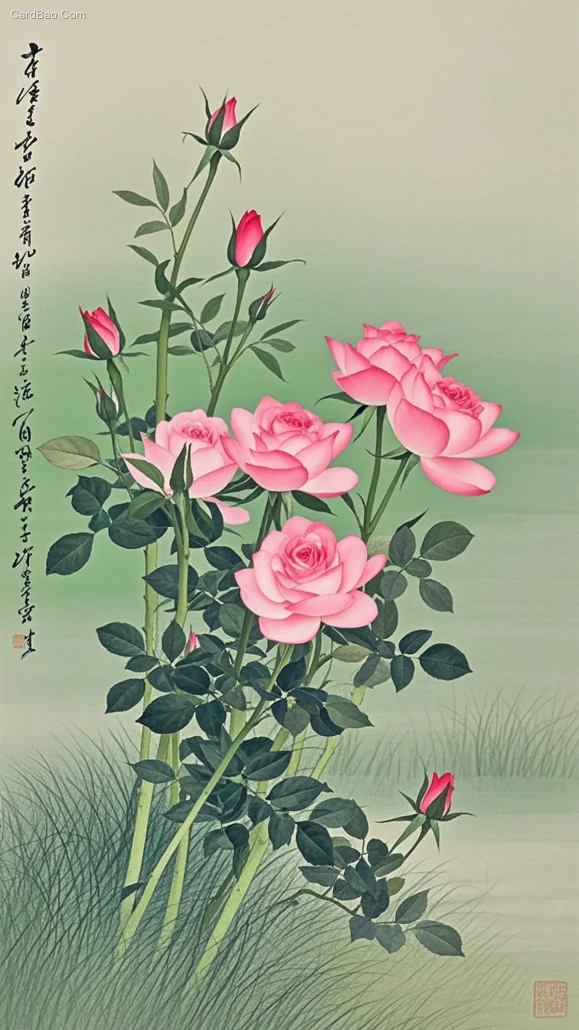 A cluster of rose bushes with green stems, featuring elongated leaves, set against a backdrop of green grass at the base. The background is softly blurred in shades of green, creating a minimalist, elegant, and zen-like atmosphere with a freehand, expressive style.