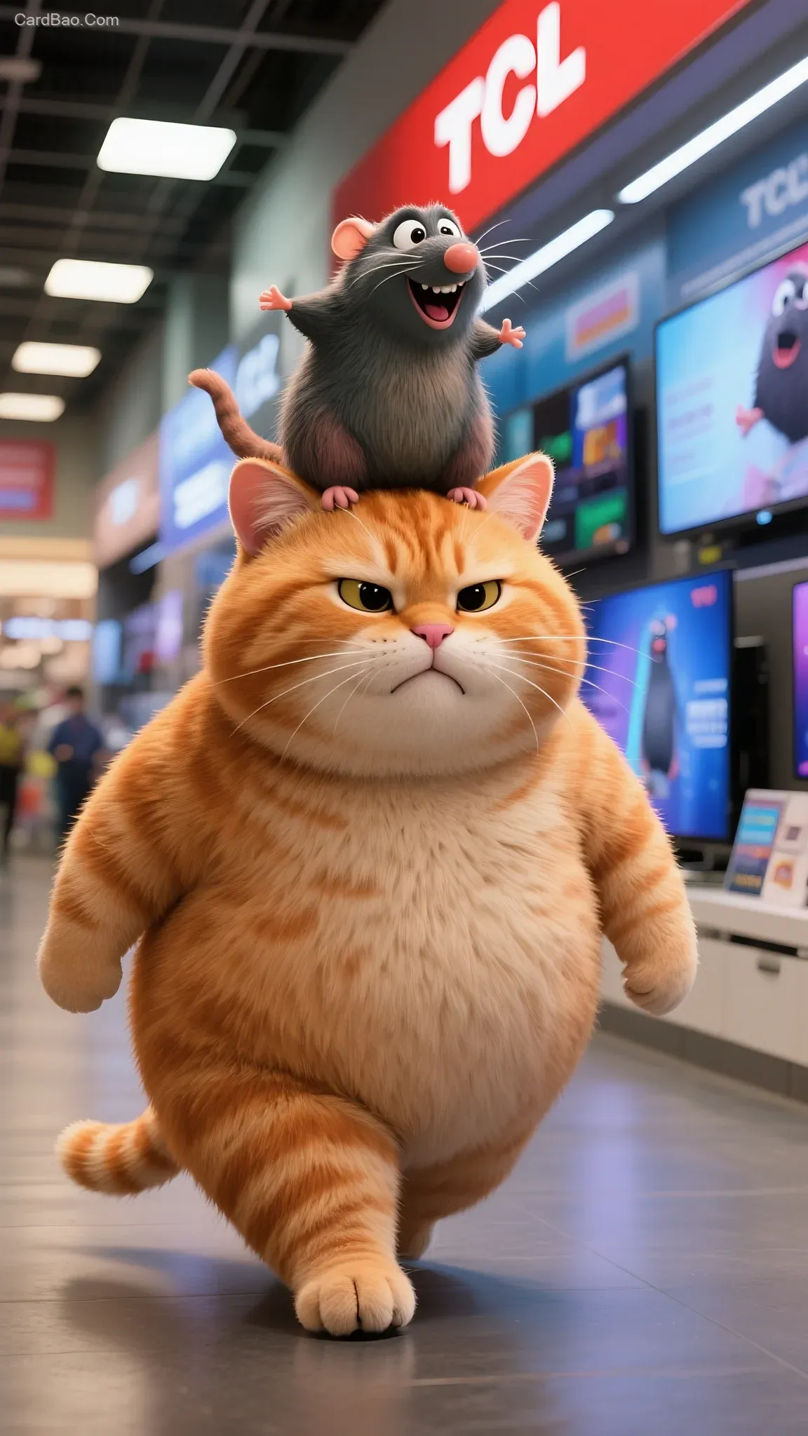 拟人写实,胖橘猫在在TCL电视销售门店行走,胖橘猫头上还坐着一只拟人化大鼹鼠。胖橘猫表情生闷气,鼹鼠很开心