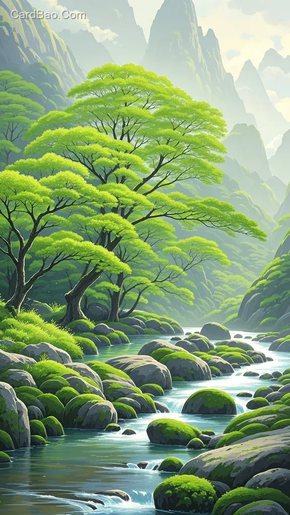 宮崎駿群山峻嶺,丙烯數字畫,绿叶浓荫的树,淡淡的晨雾,春日溪畔,蜿蜒溪流,花崗岩覆有青苔