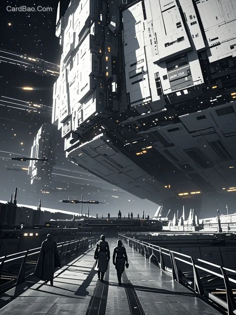 Futuristic space station, with massive spacecraft floating within, people walking on pathways between the ships. Cinematic, dark, and gritty monochromatic color scheme, reminiscent of Star Wars style, with surrealistic details. A wide-angle lens conveys a sense of scale and grandeur, featuring futuristic architecture and a backdrop of space traffic. Cinematic quality with stark contrasts between light and shadow, rendered in 32K resolution, delivering a refined and high-end visual experience.