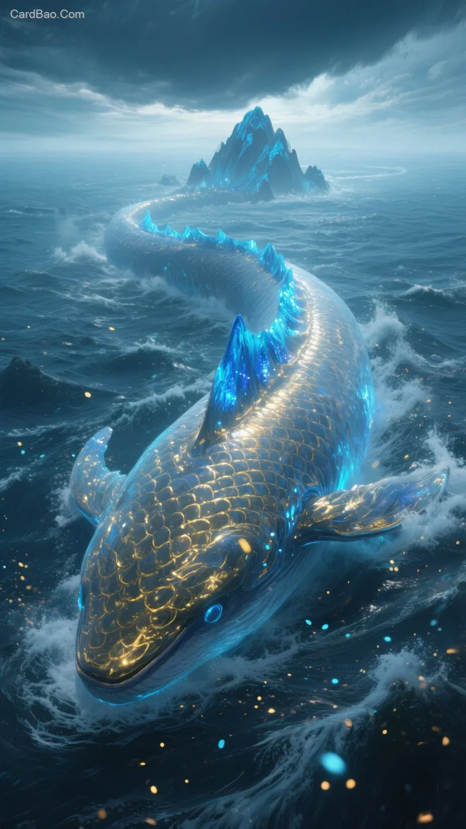 Overhead view, with mysterious and grand lighting, 8K high-definition quality, photographic style featuring delicate and realistic rendering. In the North Sea, there is a Kun fish that spans thousands of miles, its enormous body blocking out the sky and covering the sun. Its body is adorned with mysterious, gilded transparent scales that shimmer with an ethereal blue glow. The fish is both slender and incredibly broad, with massive blue glowing mountains on its back. The sea is turbulent, with waves crashing and churning, creating a scene filled with fantasy and grandeur. The composition is bold, with a strong sense of dynamism, as if particles are dancing through the air, delivering a powerful visual impact.