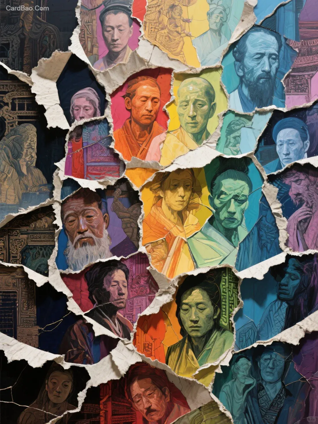 Impression, lingering dream, kaleidoscopic colors, traversing past and present, unconventional, psychedelic light and shadow, reality and surprise, intricate details revealed within complexity, grand freehand brushwork, torn paper collage, strong contrasts, breathtaking impact, a master-level collectible piece, sparing no ink. The bewildering visage of humanity.