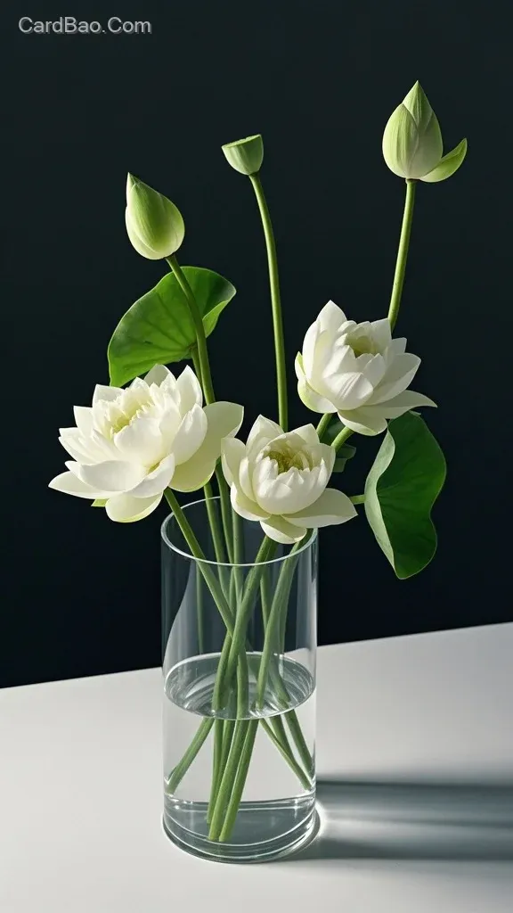 生成一张 纯黑色背景 白色的桌子上放着一个高高的圆柱形透明亚克力插花瓶,瓶里装着56朵荷花。荷花有开了花的,有的还带花苞 绿色的叶子。 超高清真实