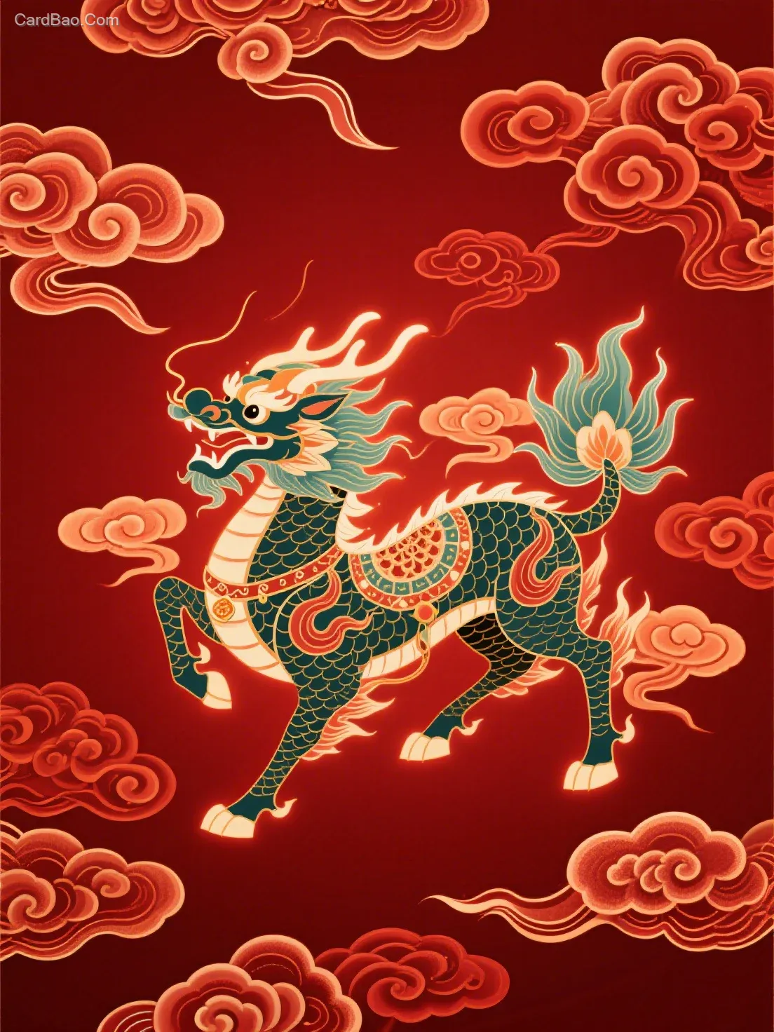 暗红色背景,细节,和玺彩绘配色,祥云,意境,矢量图,发光,细节,高清,大师级,祥瑞麒麟