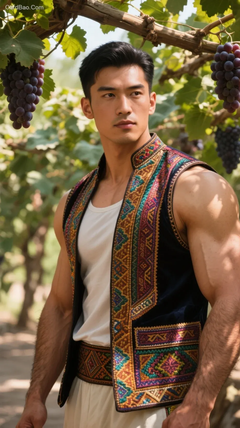Sunlight filters through the gaps in the grape leaves, casting dappled shadows and light on the man's body. This illuminates the texture of his vest and the contours of his face, enhancing the three-dimensional effect and highlighting his unique ethnic charm and masculine appeal.