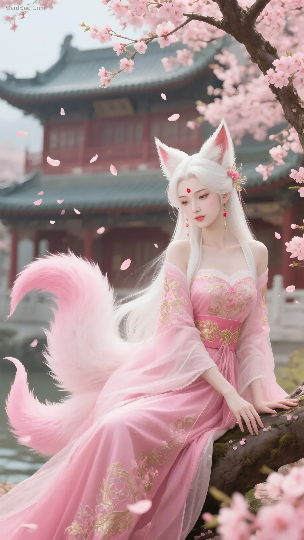 人形九尾妖狐人形,白色长发,绝世容颜,表情妩媚,穿着粉红色鎏金刺绣襦裙,额头朱砂点缀,斜倚桃花树下,粉红色尾巴,粉红色花瓣飘落,背景虚化古典楼阁,工笔重彩风格,HDR色彩强化。