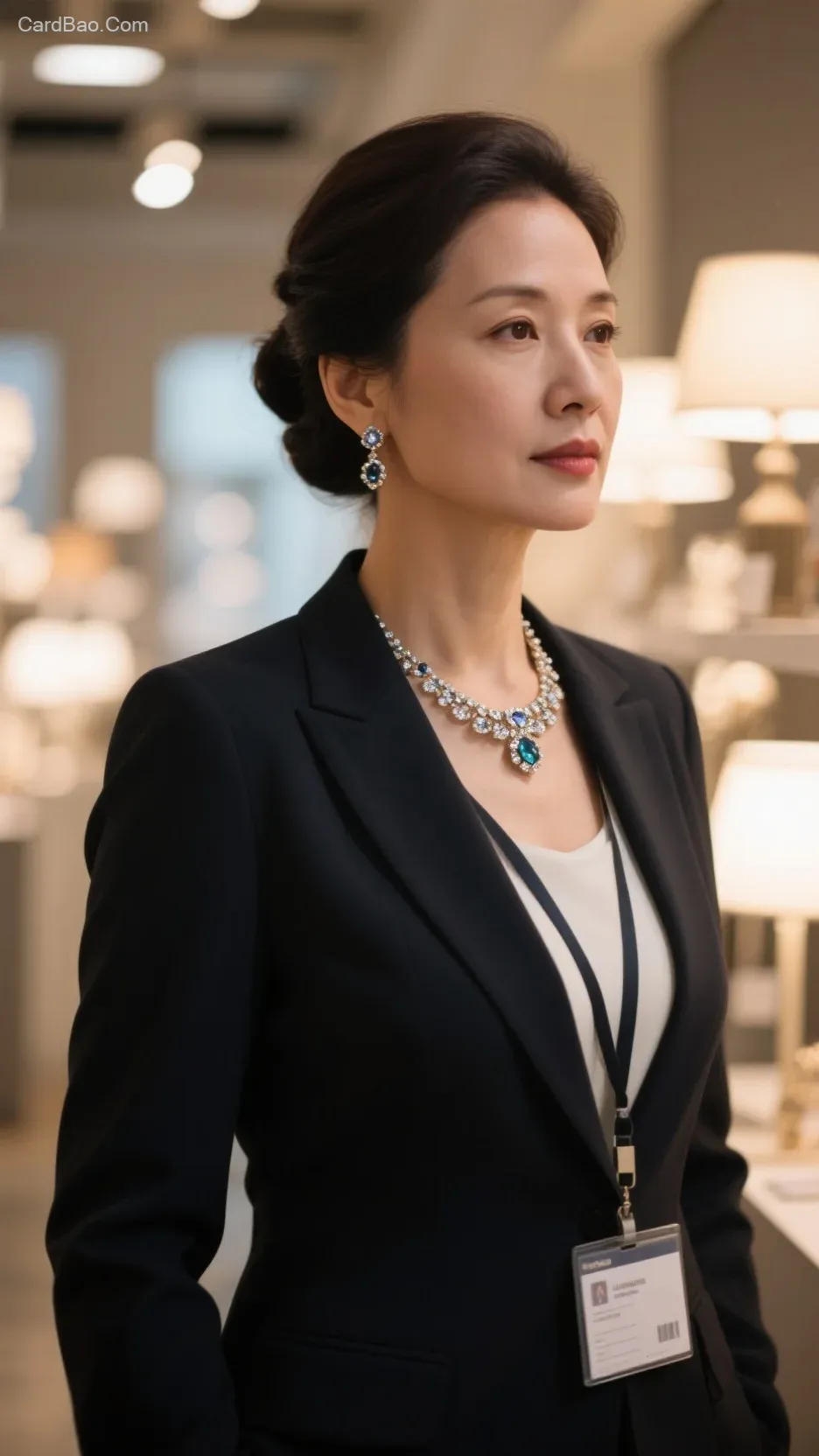 在室内灯具馆或展览馆场景中,背景隐约可见一华丽宝石项链、耳朵戴着相配耳环,胸前挂着工作牌的40岁成熟美女,头发盘起,呈现出干练整洁的职业形象,光线柔和,风格写实