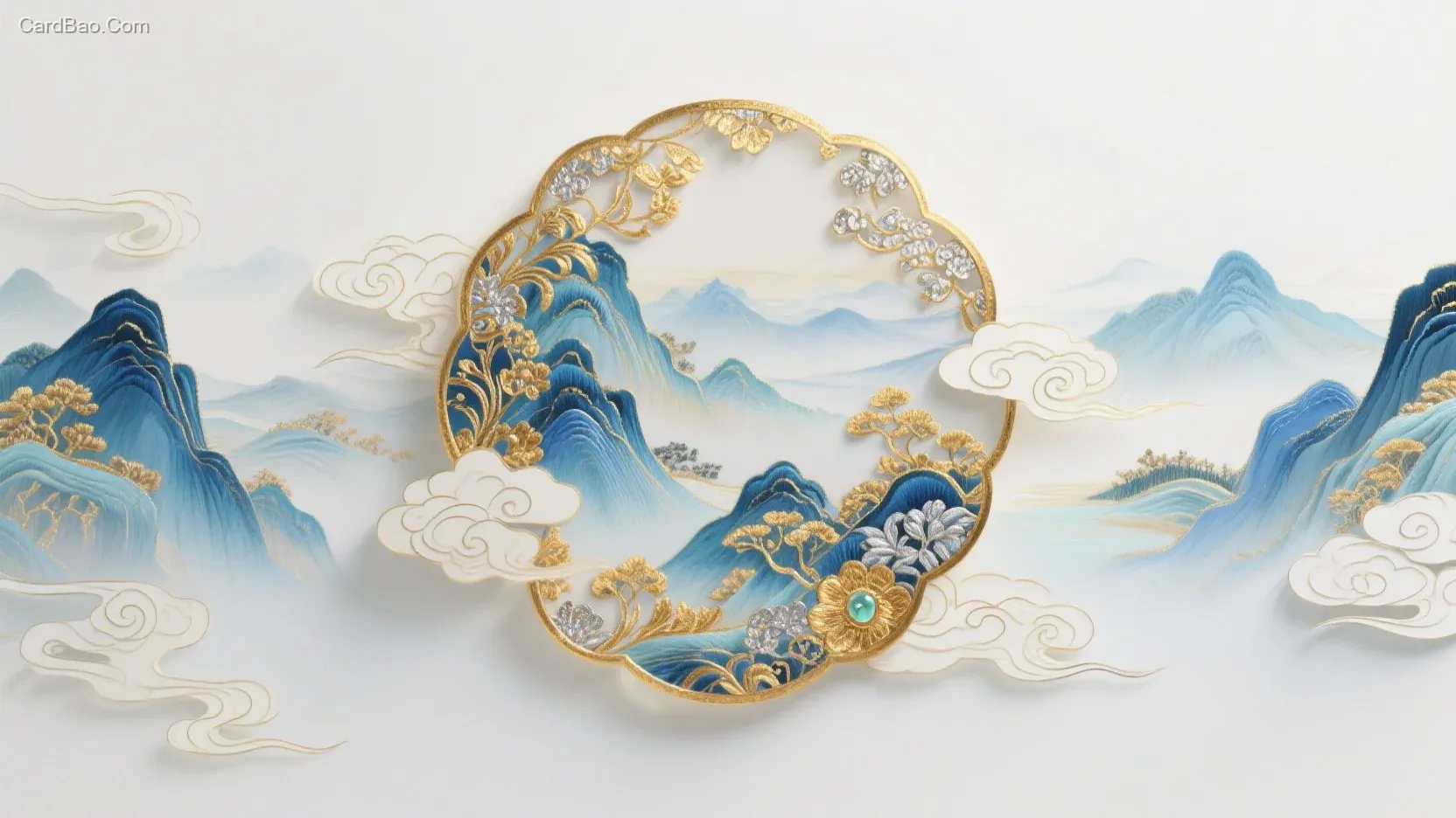 Chinese-style artistic background, minimalist and vast minimalism, visual design, bold avant-garde graphic design, surrealism, green mountains and clear waters inlaid with gold, jade, mother-of-pearl, gold foil, and mineral pigments, "A Thousand Li of Rivers and Mountains" painting, Chen Jialing, embroidery, three-dimensional embroidery, Suzhou embroidery, luminous threads, gold and silver threads, William Morris, high contrast, intricate details, ultra-high-definition quality, artistic conception with blank space, light gradients, soft side lighting, neutral background, minimalist texture, warm indigo-blue tones, transparent classical pattern background, three-dimensional style. Classical auspicious clouds drifting with an ethereal, immortal aura.