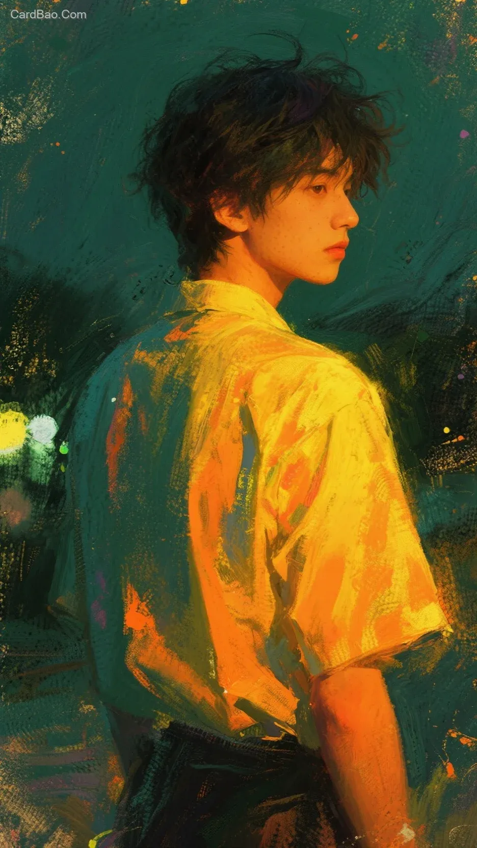 Pour emotions through colors, constructing a sense of solitude that escapes scrutiny. A rough and distinct granular texture, like the passage of time rubbing against the emulsion of memory, enhances the distant poetry of memories fading and yellowing like old photographs. Deep ink green paired with vibrant orange-yellow creates a highly saturated, stark contrast, akin to a story abruptly halted, unfinished, with uncontrollable color dissipation, evoking a texture of memories as if sealed and blurred by time. The scene is permeated with a lonely and detached atmosphere, reminiscent of the mottled images captured by ISO400 film, combining the thick, intense, and dynamic brushstroke quality of high-saturation oil paintings with the aged, dull, and faded texture unique to expired film. Beneath the intense color palette, a faint, ambiguous emotion is subtly concealed within the depths of the heart. In the frame,