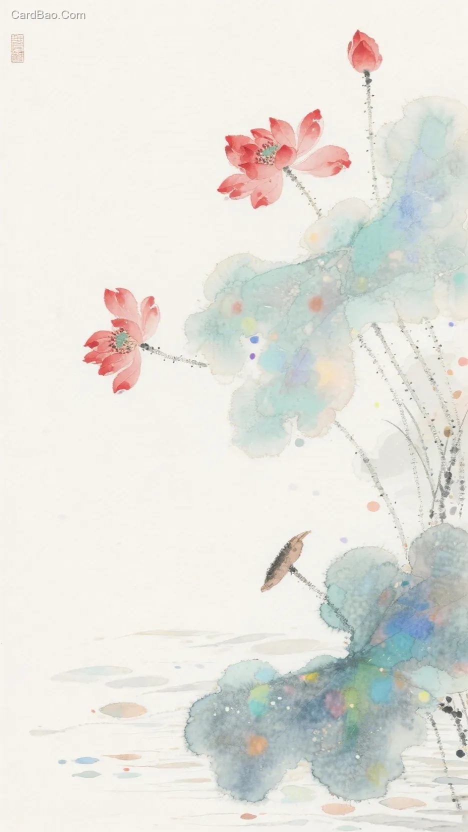 点彩水墨画 中式审美 留白 无文字,高清,何须浅碧深红色,自是花中第一流。点墨水彩,晕染,湿墨,景深构图,超广角镜头,倒影,国韵意境,中式美学,分层半透明,半透明 透明,重叠半透明,沈勤,新工笔,罗寒蕾,罩染法,透明覆色法,不同肌理,立体感、立体光影,淡雅白色背景,肌理磨砂,色块插画,高斯模糊,动态模糊,炫彩光影,俯视,大面积留白,背景虚化