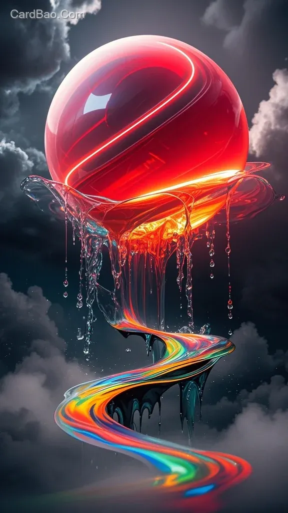 - Main element: A massive, semi-transparent red sphere, with flowing, multicolored fluid beneath it (including hues of red, orange, yellow, green, blue, etc.) forming an S-shaped curve, complete with splash effects.