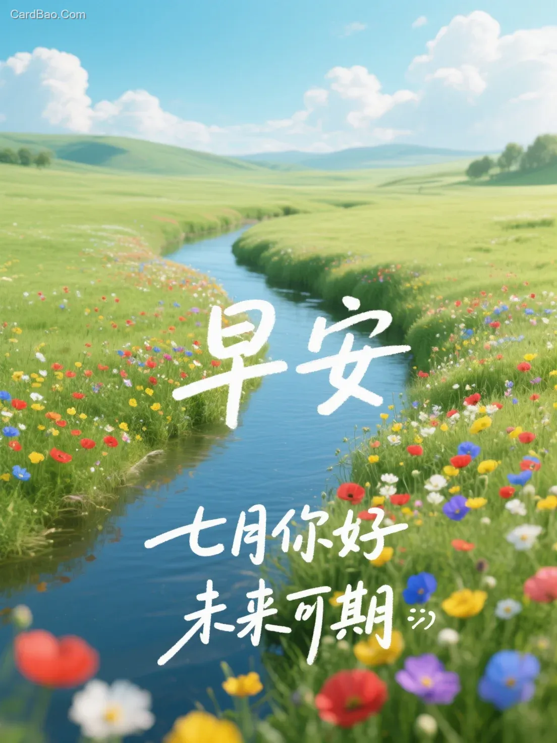 背景一片绿色平坦草原,一条小河两边开满了密密麻麻的红,黄,蓝,紫,白色的小野花,远镜头,高清,摄影作品,写实,电影效果,合适位置手写:早安 下边手写:七月你好 未来可期 字不要太大,清新风格,远处宫崎骏的童话白云,不要标点符号,草地绿一些