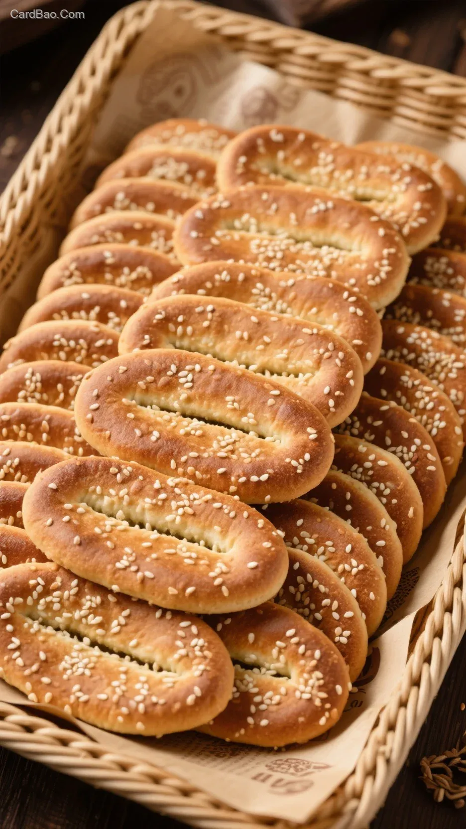 帮我生成图片:图中展示一个超大号镶有花纹长方形菜篮筐内有牛皮纸隔油垫,放上装满了荞麦椒盐酥牛舌饼,有100个,椒盐酥扁椭圆形,扁平像牛舌一样,中间有2条凹陷的沟,表面呈诱人的棕褐色,是经过烘烤形成的色泽。表面均匀撒有白芝麻,足足有20斤,增添了视觉上的层次感与香气联想。糕点看起来质地较为酥脆,纹理清晰,仿佛能感受到咬下去时的香脆口感 ,整体给人一种传统美味、制作精细的感觉。