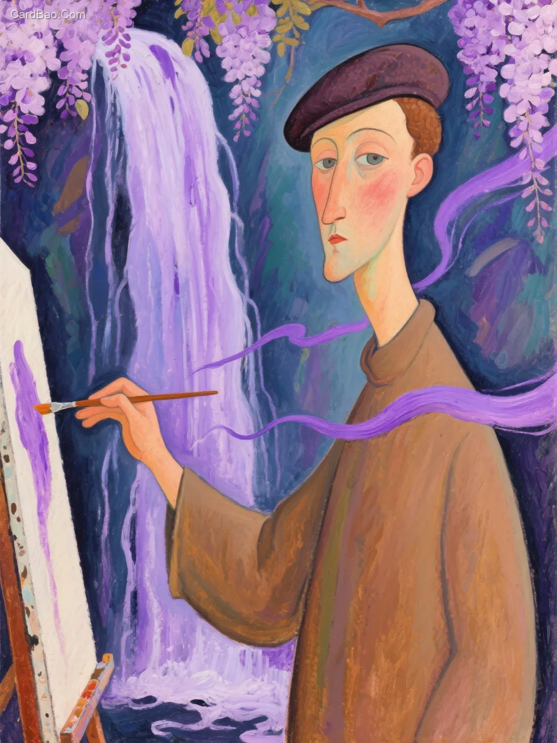 戴贝雷帽画家写生紫藤瀑,画笔甩出紫色轨迹。莫迪里阿尼变形,拉长造型,暖调肌肤,忧郁眼神,抽象背景。