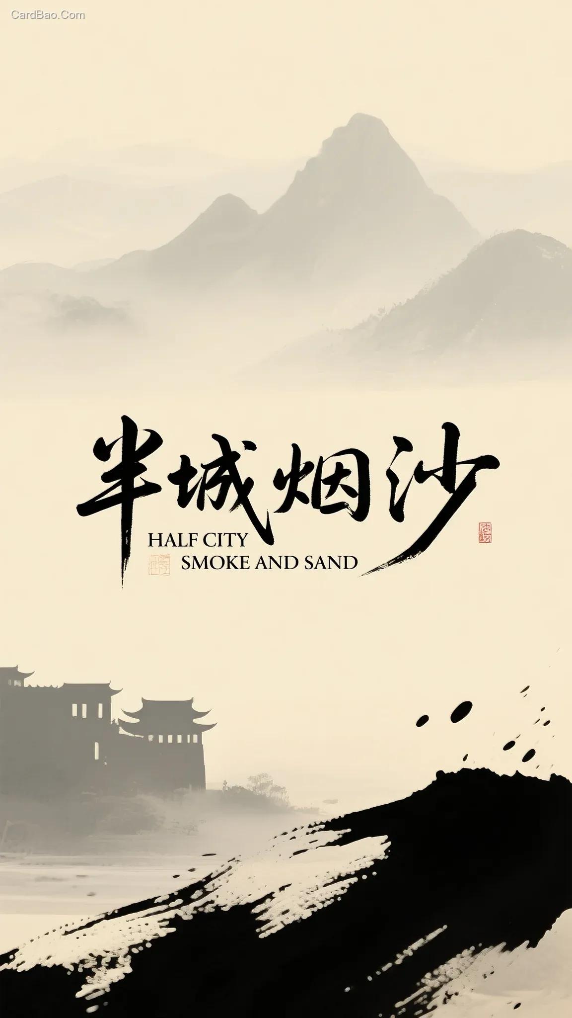 "半城烟沙"/"HALF CITY SMOKE AND SAND",水墨东方古风字体设计,潦草水墨行书,淡黄与灰色渲染,背景为古城水墨山水,排版疏朗自然,留白丰富,飞白笔触与毛笔肌理交融,线条流动富有诗意,极简与传统融合,东方禅意,艺术氛围浓厚,细腻雅致,杰作