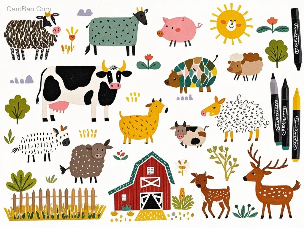 Vince Low,Catherine Rayner,平铺,各种农场动物和田野动物,画面中间一座小小的农场,简笔画,可爱萌风格,清新自然的色彩,白色背景,干净的背景,留白,8K,马克笔手绘线稿