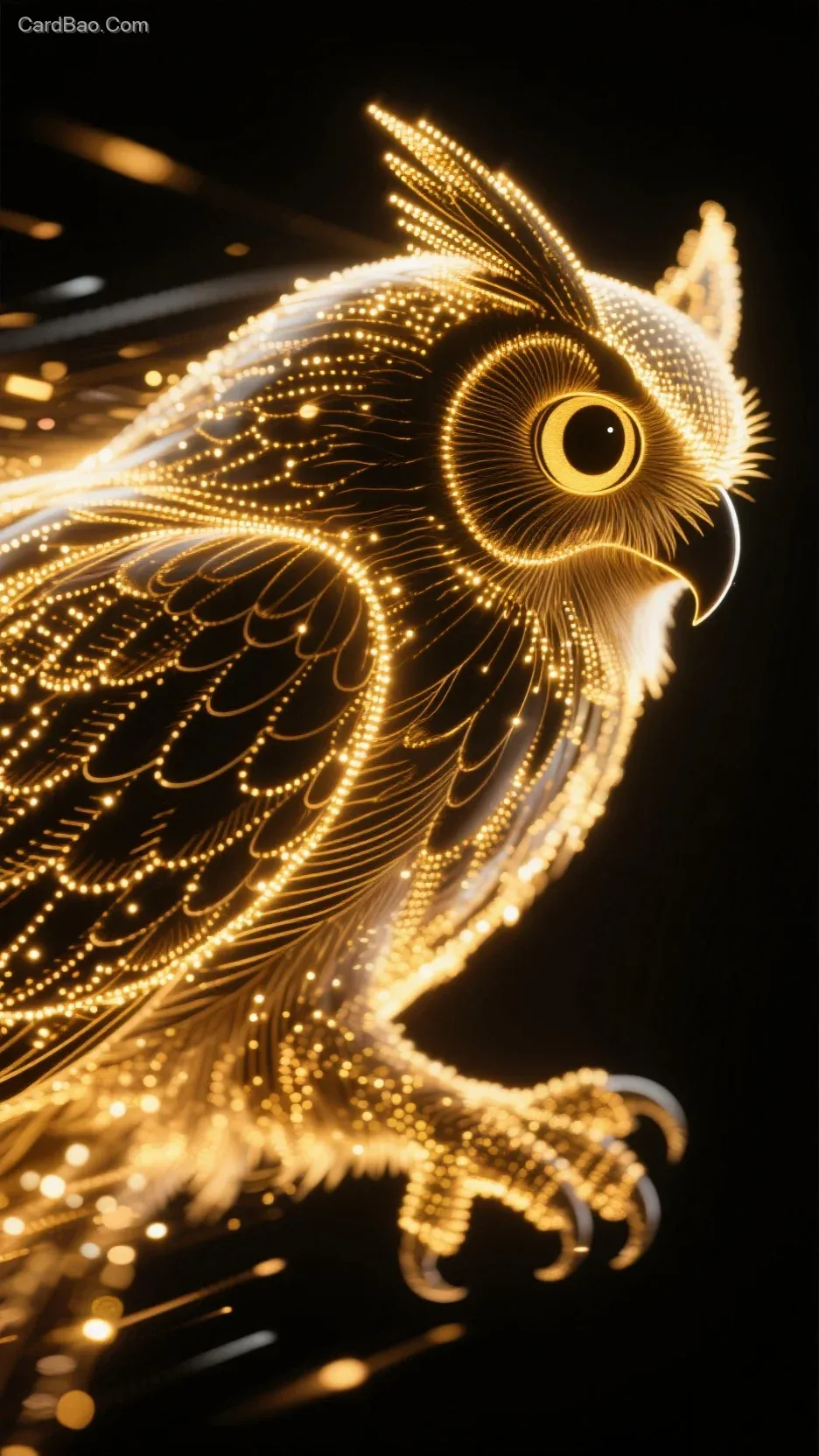 由发光流动粒子组成的猫头鹰头部,极速飞行的动态效果,侧视图,金色动态光线和粒子效果,微小粒子线条构成的羽毛,动态模糊,速度感,高噪点,细节丰富。黑色背景,通透,大师作品