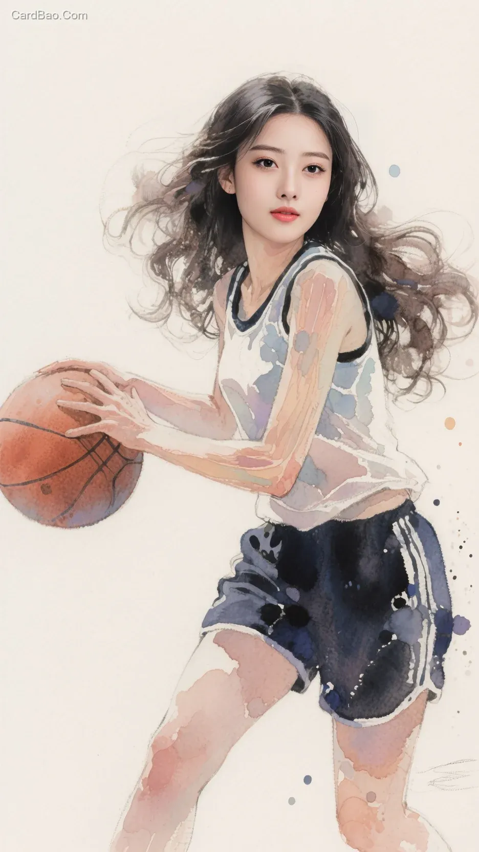 ##一女孩子打篮球,柔软蓬松的长卷发,晕染、透叠、色域分割、动态速写、肌理表现、空气透视、分层渲染、正负形、点彩、湿画法、解剖结构、张力线条、视错觉、渐变融合