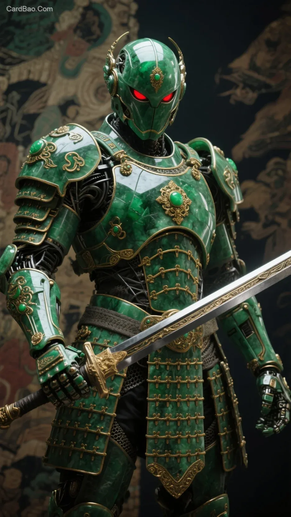 一个穿着全覆盖流线型玉石装甲,戴着全覆盖头盔的机械战士,全身青绿色翡翠玉石颜色,中间有金丝连接甲片,装甲上有汉朝墓葬壁画的纹路,头盔全包裹,红色双眼,还有巨大日本武士风格的翡翠装饰