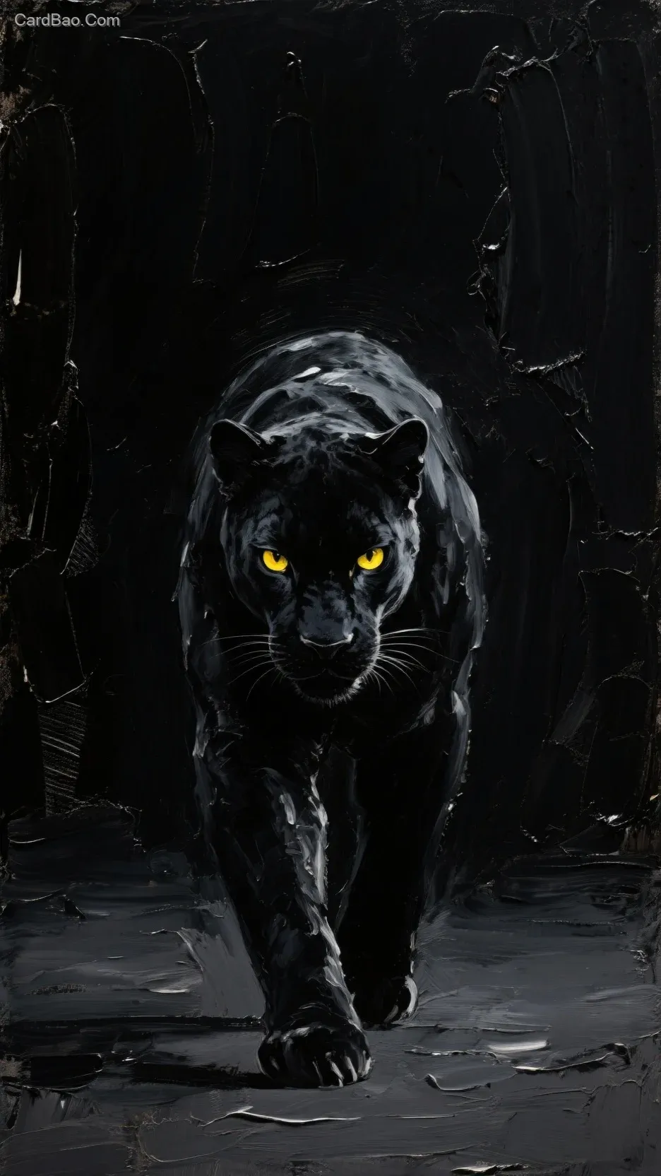 A black panther faces the camera, approaching step by step, its yellow eyes gleaming with ferocity, creating a sense of awe. Its dark body merges seamlessly into the black background, with thick impasto textures formed by palette knife strokes, rendered in the bold, rough brushwork of Fauvism. The panther occupies the lower third of the composition, while the upper portion features expansive negative space.