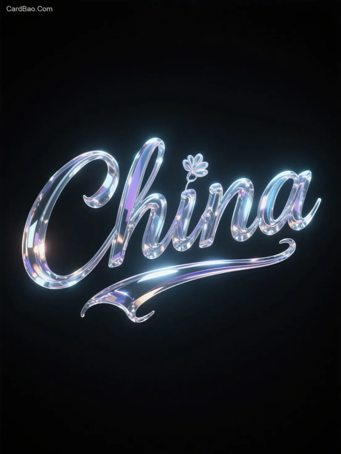 水晶质感文字与黑色背景:在C4D里创建 “China” 文字,字体设计为灵动的手写花体,线条优美。文字模型呈现出璀璨的水晶质感,内部有细微的折射和光芒散射效果,仿佛由无数细小的晶体组成。黑色背景深邃神秘,与闪耀的水晶文字形成鲜明对比,突出文字的华丽与梦幻。