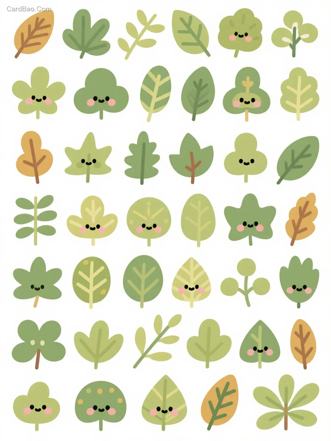 An illustrated guide featuring various shapes and types of leaves, designed in a cute chibi style with clear outlines. Set against a white background and created in vector format, making it suitable for seamless tiling as stickers. Neatly arranged with basic educational information, ideal for nature education or decorative purposes.
