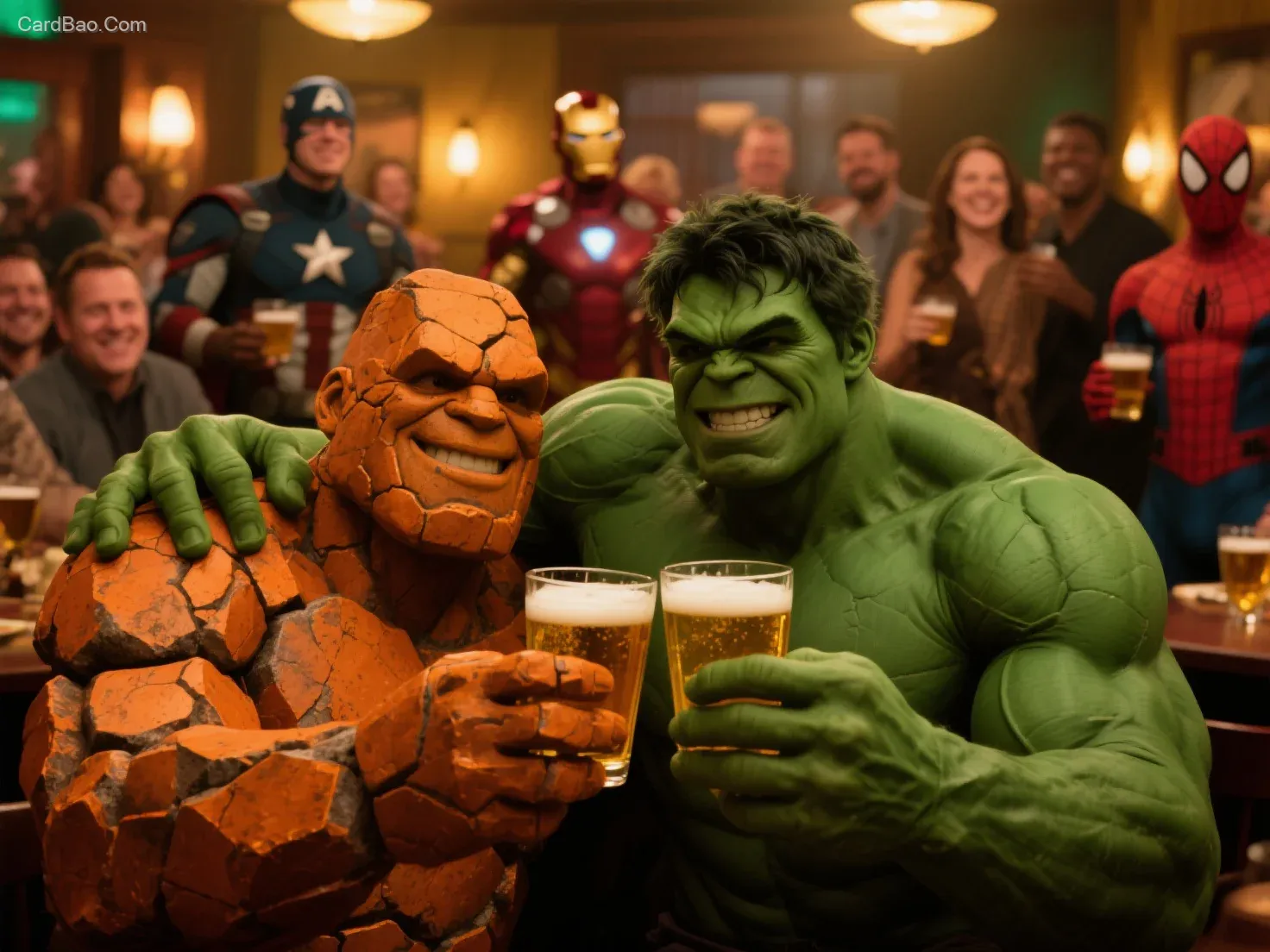 写实风格,真人质感,电影光影,半身特写,绿巨人与石头人肩并肩坐在一起,轻松愉快地笑着,绿巨人搭着石头人的肩膀,两人高举透明啤酒杯轻轻碰杯,杯中泛着金色泡沫。面部笑容自然放松,绿巨人皮肤为真实绿色质感,有皮肤纹理与肌肉细节;石头人橙色岩石皮肤厚重,岩块纹理清晰,表情憨厚友善。背景为温馨昏黄灯光的室内场所,如酒吧或庆功宴,画面后方模糊景深中,可见美国队长、钢铁侠、雷神、蜘蛛侠等其他漫威英雄正在聊天、举杯或微笑围观。人物背景模糊处理,焦点清晰锁定在绿巨人与石头人面部与酒杯之间。画面色调温暖,气氛和谐友好,构图比例为4:3横向,真人写实风格,非卡通,非插画,非3D渲染,细节真实丰富,有电影画面质感