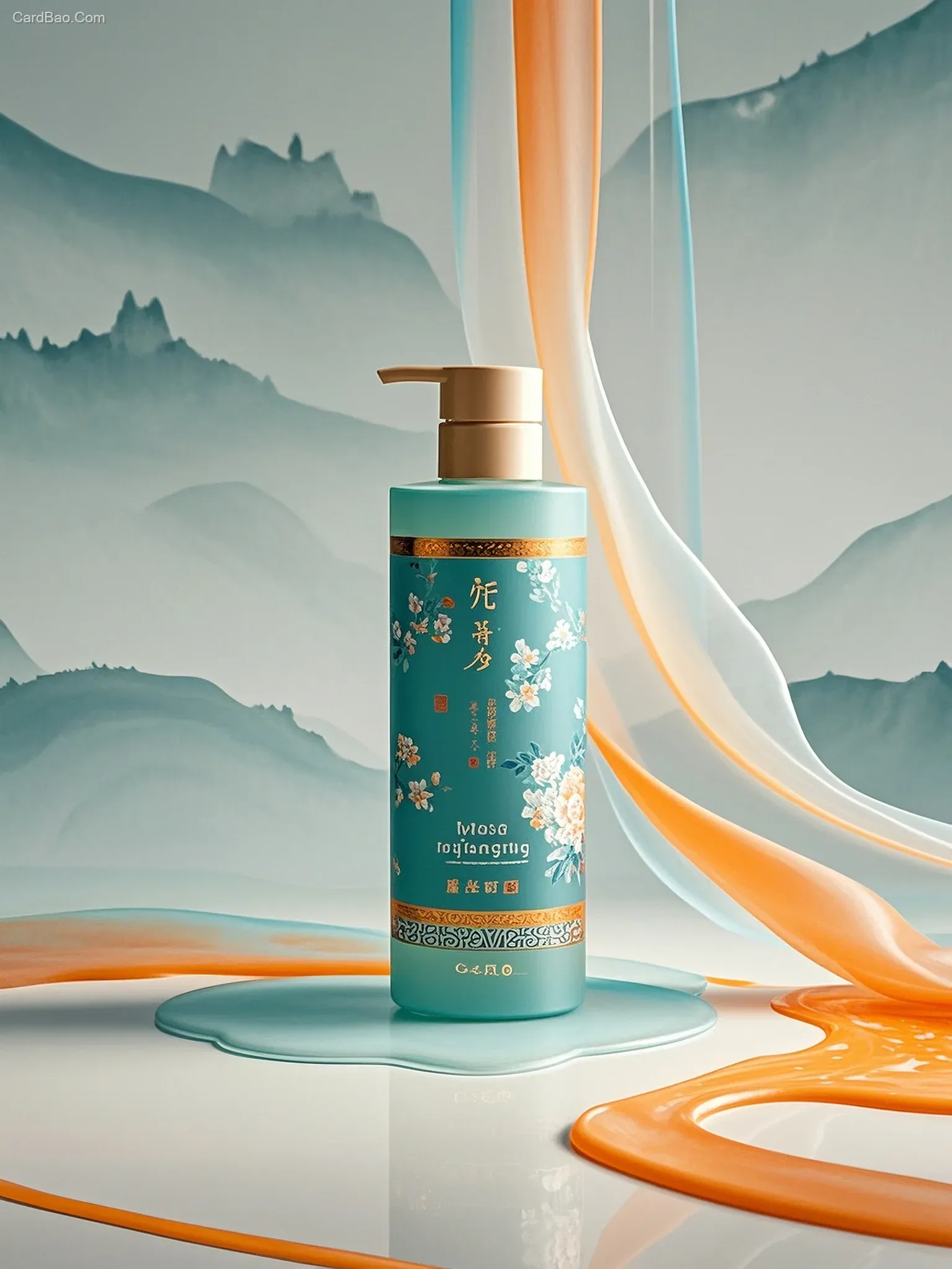 Close-up of a beautiful shampoo packaging, featuring white, green, blue, apricot, and orange hues. Floral motifs evoke a dream-within-a-dream aesthetic, with rich layers and subtle hidden patterns. The design conveys a melting, diffused gradient effect, with flowing gauze-like textures and elegant lines. Ink-wash rendering enhances the minimalist style, while multiple exposures add a hazy, ethereal quality. A masterpiece embodying Chinese aesthetics, the distant view resembles the delicate emptiness of traditional gongbi paintings, with soft gradients and diffusion.