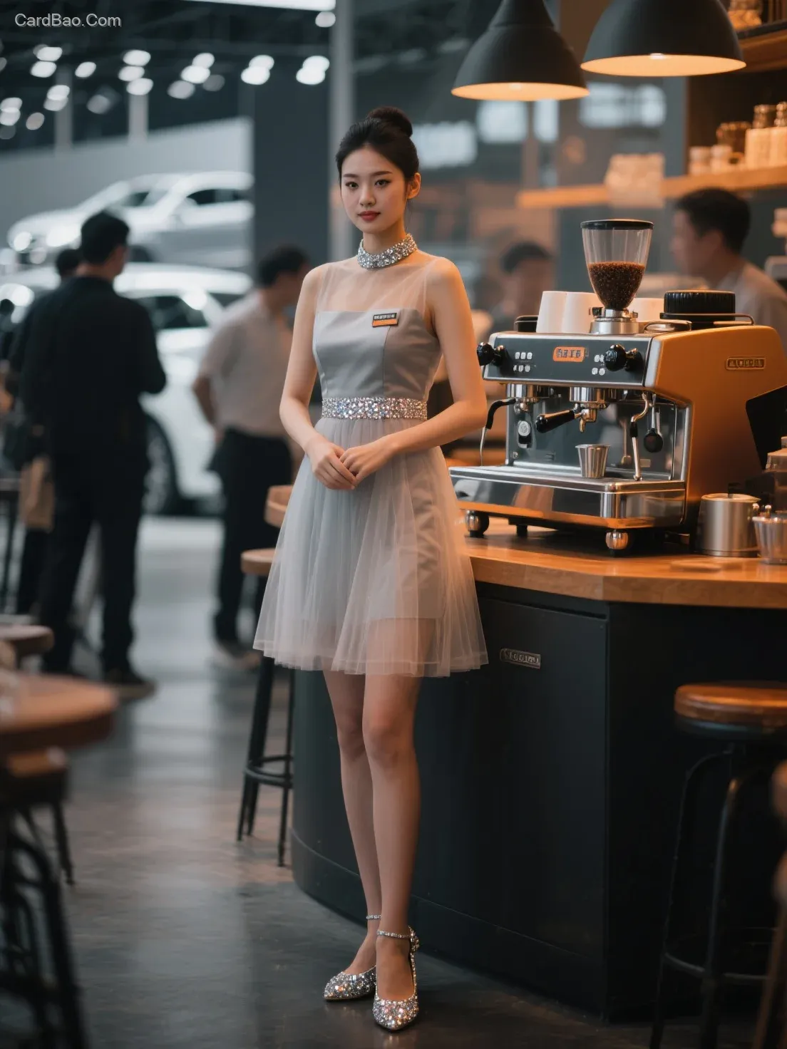 模糊的车展礼仪小姐,纱质制服,带水钻装饰的平底水晶鞋, 虚化模糊的咖啡机与人影交织,大场景,双重曝光,即时咖啡馆氛围,广角,对焦主体, 空气感褪色处理,暗调,橙黄,低饱和冷灰色调, 哑光磨砂质感图层,故事感,情景写意,艺术电影画面构图