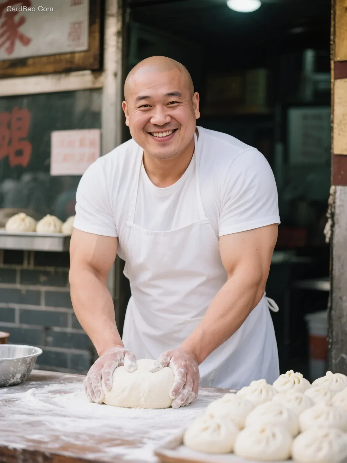 一个极具沧桑感的东亚人,35岁,健美肥胖肌肉光头,白色T恤,围裙,面带微笑,在包子铺门口揉着白色的面团,面对镜头,高清,细节完美,有故事感