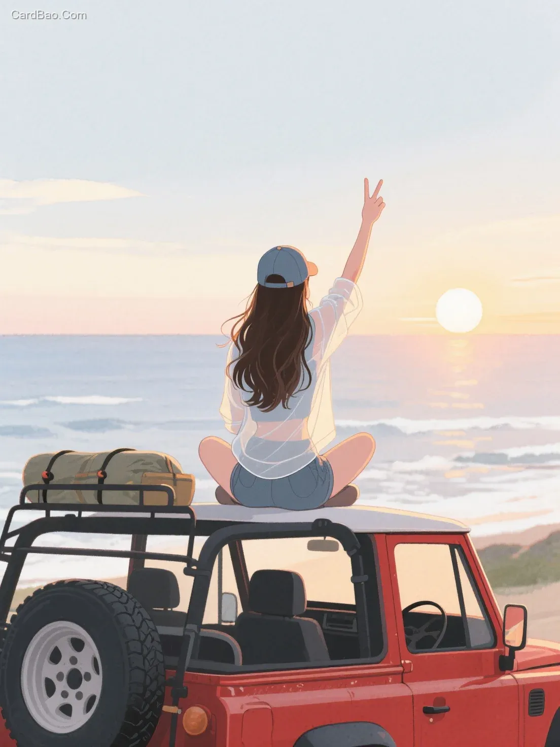 主题:长卷发女子背影盘腿坐在红色越野车顶,女子穿着时尚,穿着防晒衫,戴着鸭舌帽举右手比耶手势,远处初升太阳,背景海边,越野车有备用轮胎和行李架,温暖晨光与冷色调天空形成对比 美学:治愈系水彩手绘风格,柔和渐变色彩,扁平化人物造型,细腻光影层次 专业:4K插画细节,低饱和度配色方案,景深虚化处理,画面留白构图,柔和边缘过渡