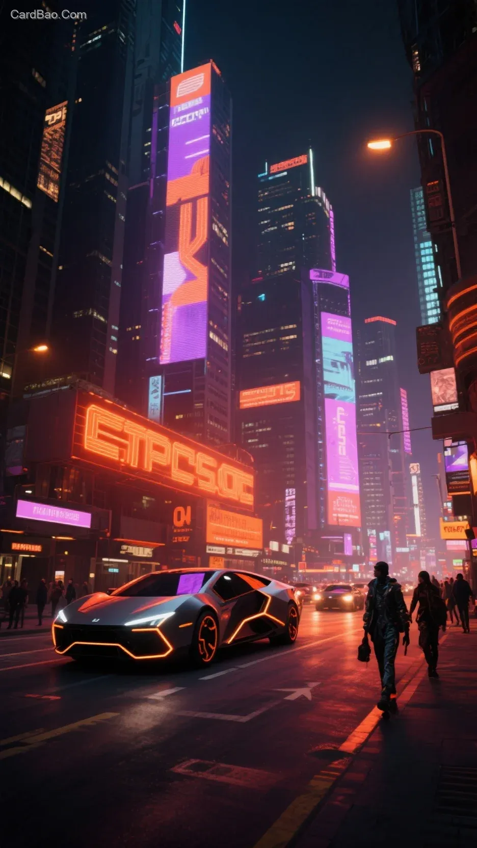 Cyberpunk-style city street scene, a bustling metropolis at night with towering skyscrapers, massive neon-lit advertising billboards flashing with vibrant lights, exuding a futuristic vibe. The streets are filled with uniquely designed, sleek sci-fi vehicles in motion, while pedestrians don futuristic attire. This highly advanced technological future world is dominated by orange-red and purple hues, featuring strong contrasts of light and shadow. Professional composition with the golden ratio technique, embodying cinematic literature and artistic aesthetics.