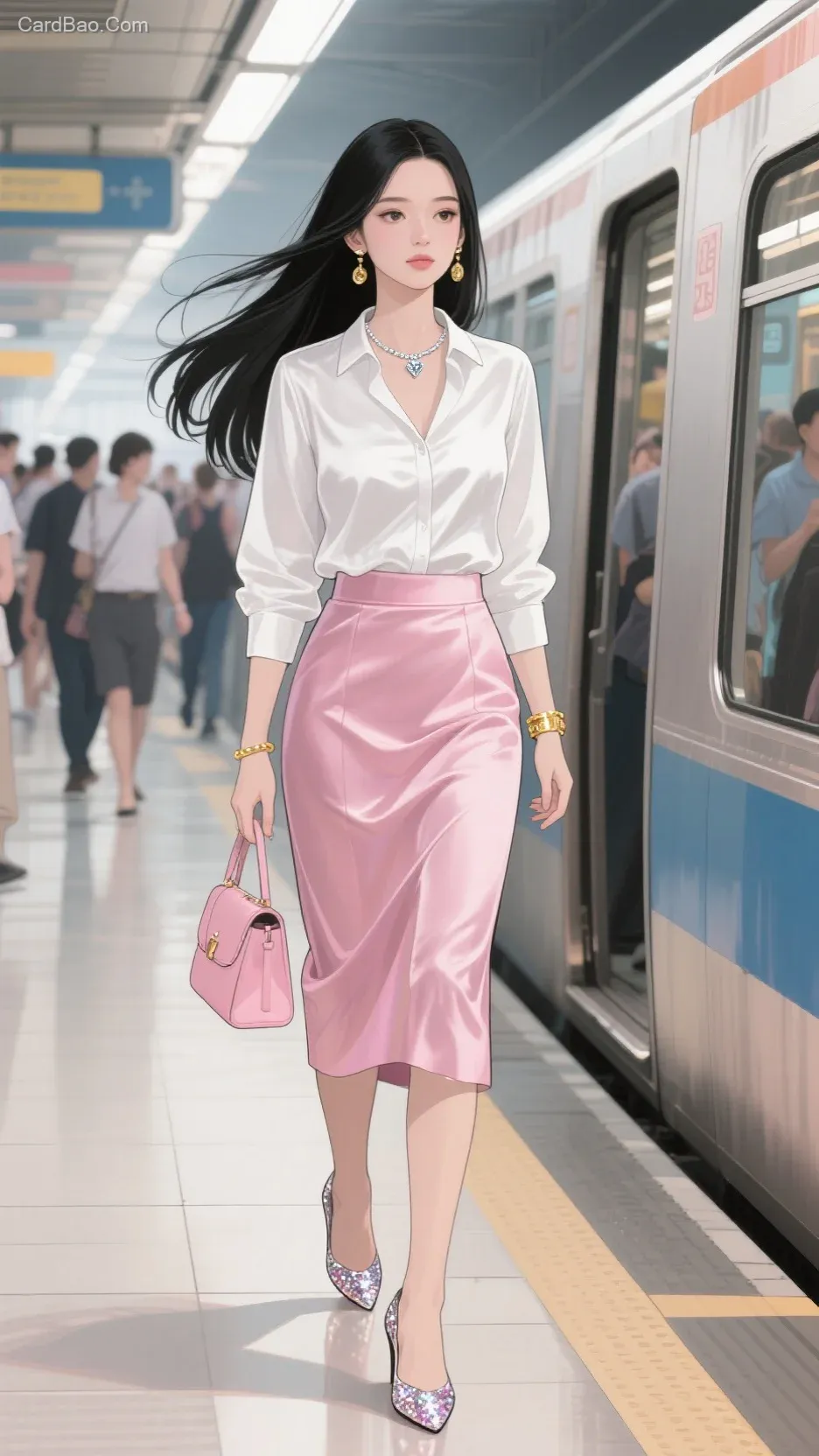 夏日的地铁站里,人群来来往往。一位26岁的女性,冷艳高贵,皮肤白皙有光泽,黑色长直发在微风中轻轻飘动,眉如远黛,眼神清冷深邃,鼻梁高挺笔直,嘴唇线条优美且带着淡淡的冷漠,脸型精致小巧,轮廓线条流畅而有立体感,脖子上戴着一条纤细的银色锁骨链,链坠是一颗小小的钻石,穿着白色缎面衬衫、粉色缎面高腰半裙,戴着金色耳环、手镯,拿着粉色手提包,脚穿细跟尖头的水晶(亮片)高跟鞋,优雅地走在地铁站台,等待地铁。手绘治愈系插画风格。