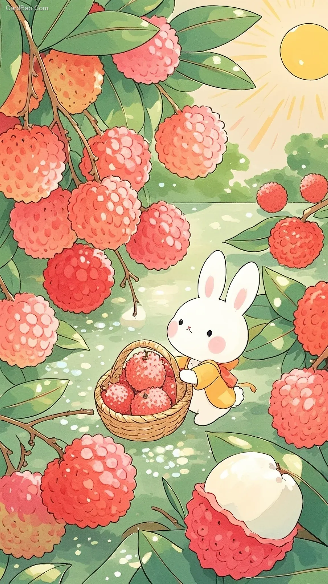 水彩风,艺术家Yeoniu Choi风格,Q版,卡通平面风格,满屏被荔枝覆盖,可爱的小白兔挎着装满荔枝的篮子, 观望成熟的荔枝,阳光明媚 色彩明亮,面面温馨,精致细节,细节刻画,全屏超清,32K分辨率,萌系。